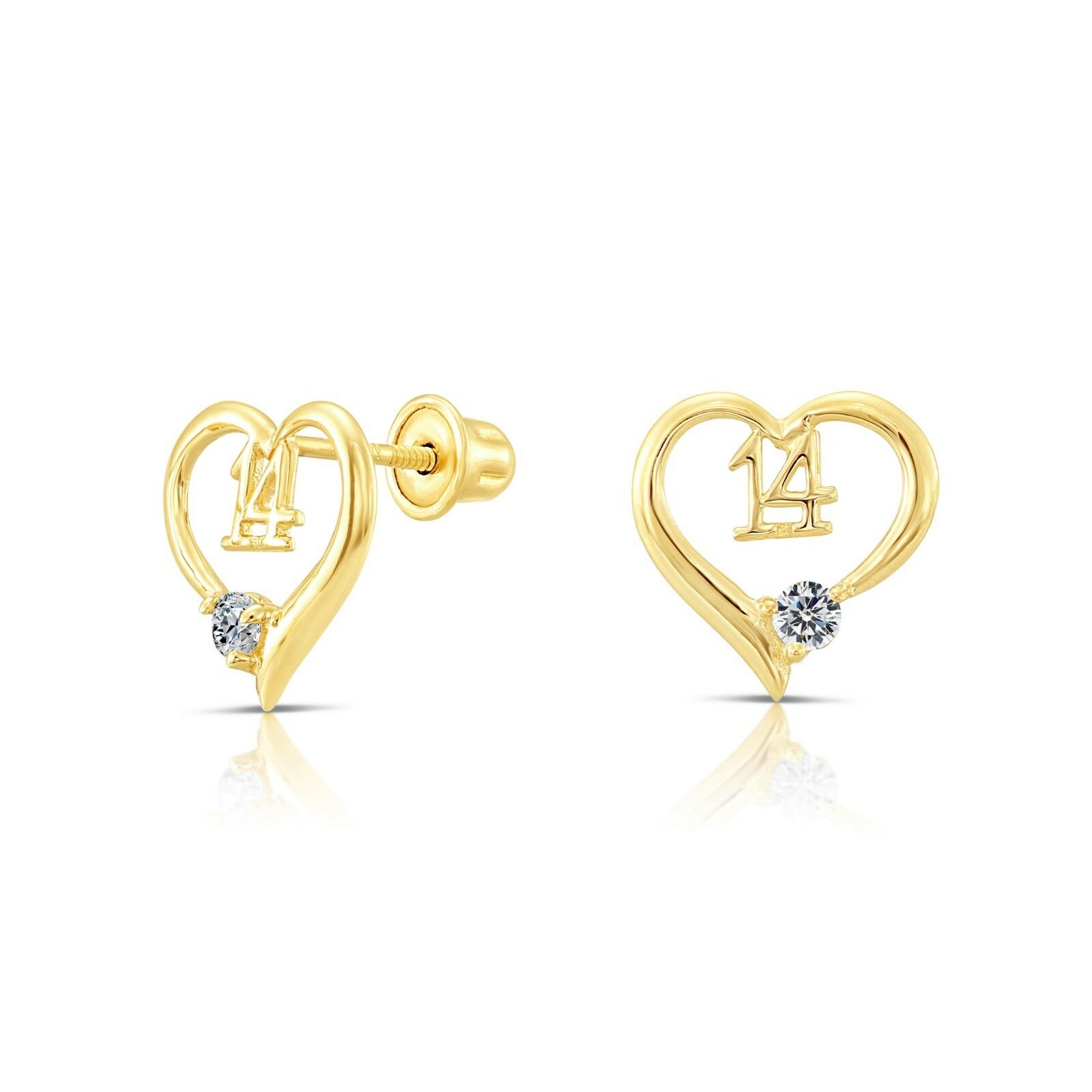10k Yellow Gold Open Heart "14" with Cubic Zirconia Stud and Secure Screw-Backs 9mm