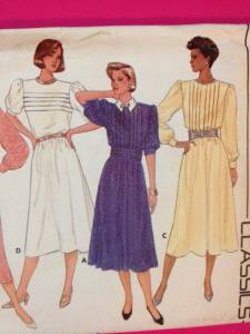 LOOSE FITTING DRESS HAS SHOULDER PADS, ELASTICIZED WAIST, SLIGHTLY FLARED SKIRT, BACK ZIPPER AND SHORT OR LONG SLEEVES WITH BUTTON CUFFS