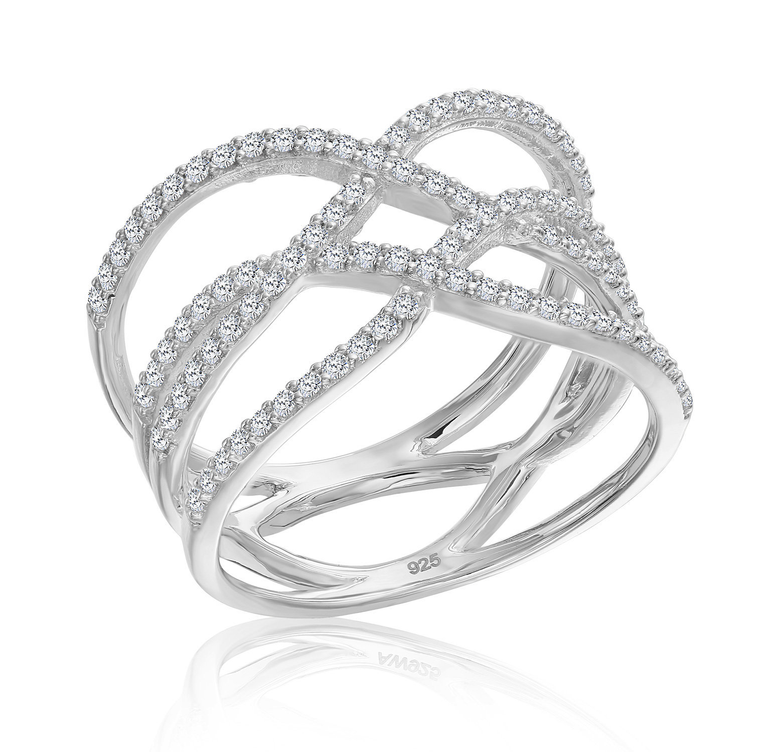 Multi bands of brilliant round CZ intersect each other in a criss-cross design and look stunning. Handcrafted in sterling silver and set with cubic zirconia shimmers for extra shine like diamonds. They're high polished by hand and easy with high-impact shine bright like white gold.