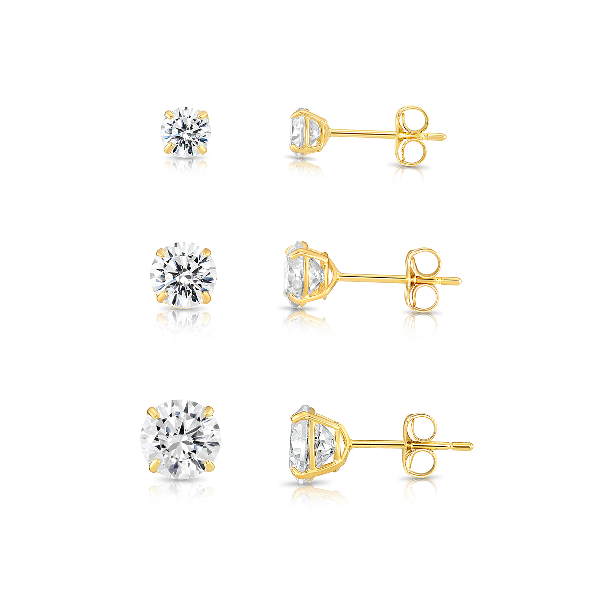 14k Real Gold CZ Basket Set Round Stud Post Push Back Earrings Set Of 3 Pairs