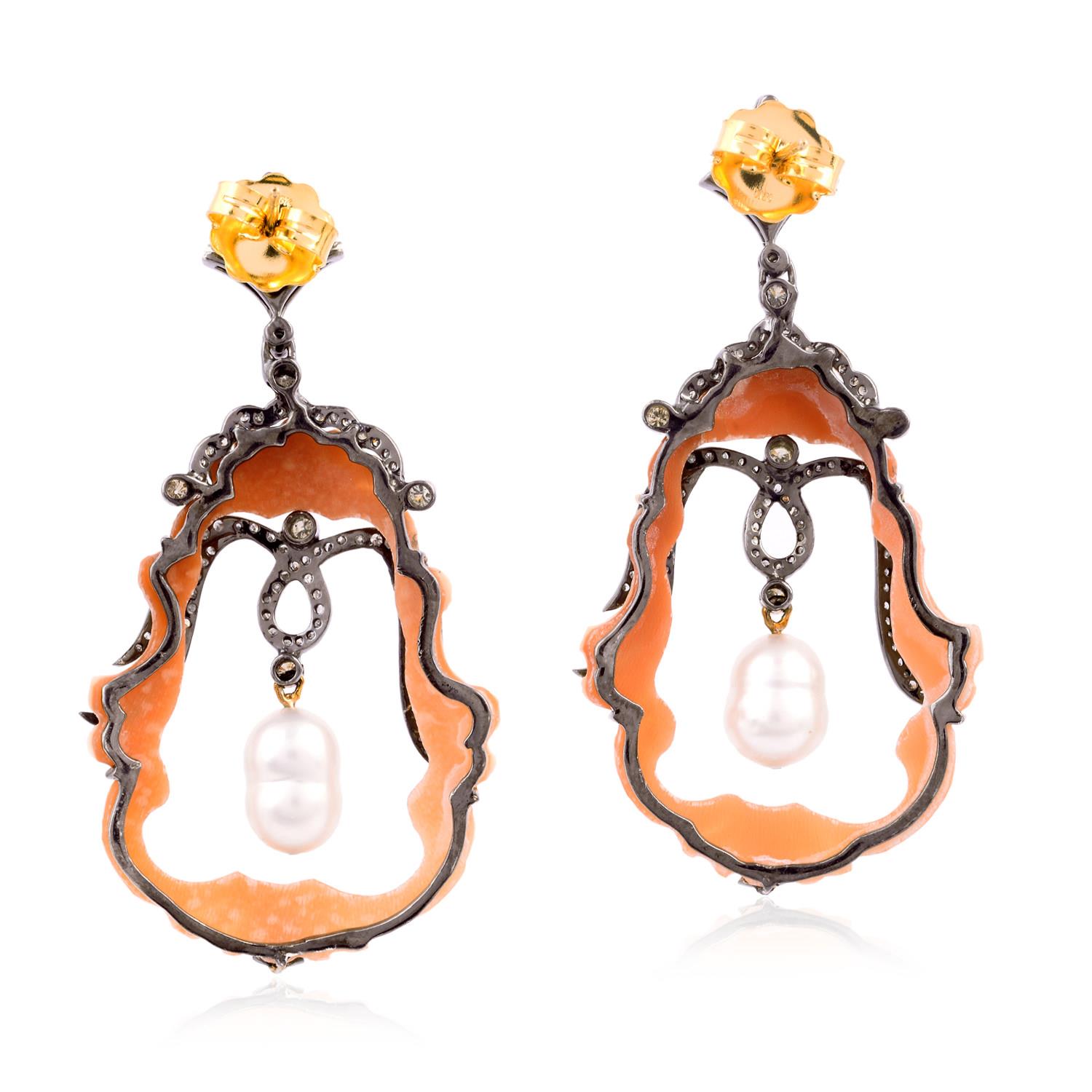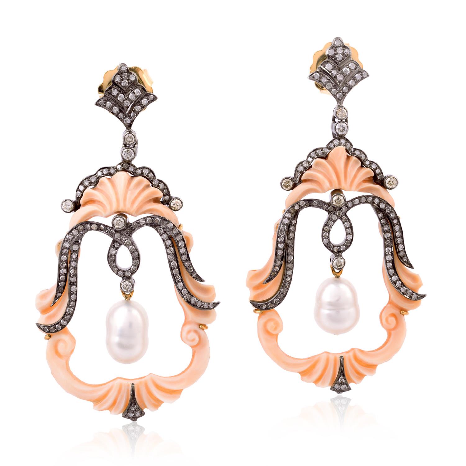 18k Gold Pave Diamond Carved Cameo Pearl Drop Dangle Earrings 925 Silver Jewelry