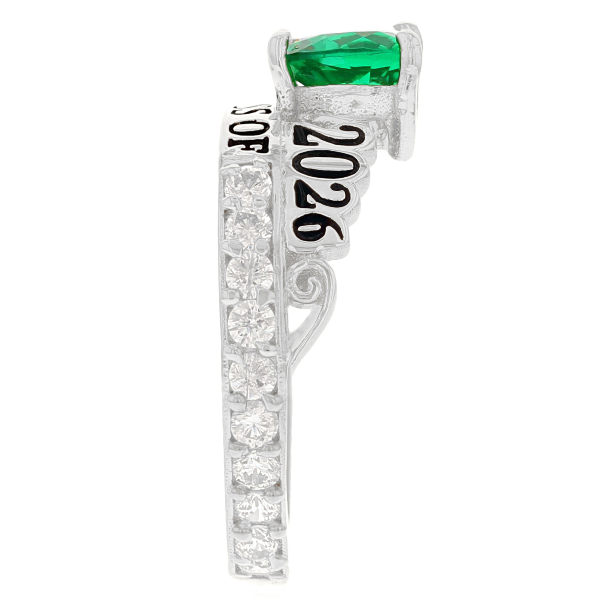 An exquisite Heart shaped Simulated Emerald is prong set at the center of this Class of 2026 graduation ring. The stone is a perfect accent to the piece and adds a personal touch since it is the color of the recipient's birthstone! Additionally, white CZ are set along most of the band, creating a stunning look that is sure to turn heads. Only fine 10k or 14k White Gold is used to craft this fine piece of jewelry. Show that graduate in your life how important their milestone is with this elegant graduation ring. Emerald is the birthstone for the month of May and promotes love, success, happiness and goodness. Our rings are proudly handcrafted in our California factory.