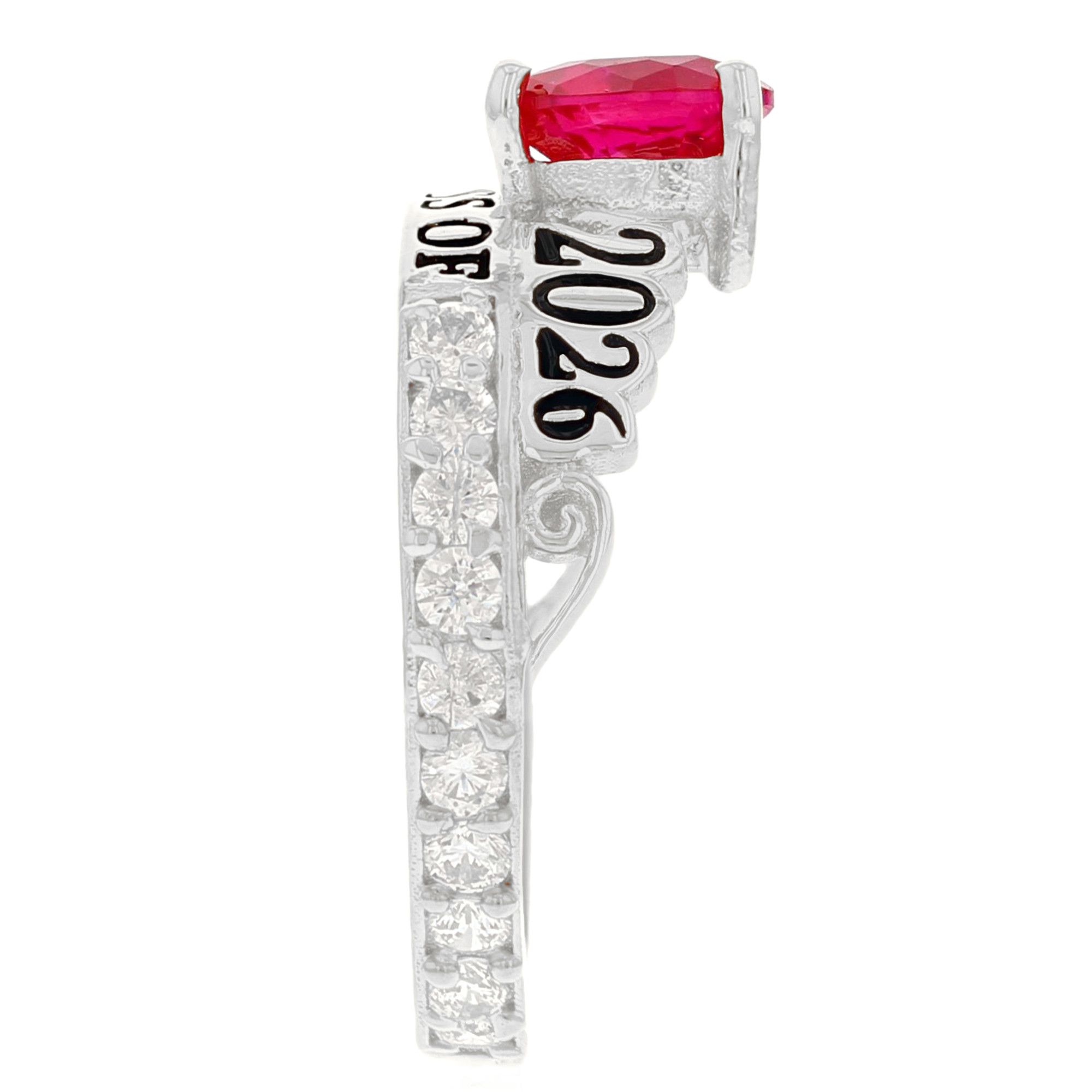 An exquisite Heart shaped Simulated Ruby is prong set at the center of this Class of 2026 graduation ring. The stone is a perfect accent to the piece and adds a personal touch since it is the color of the recipient's birthstone! Additionally, white CZ are set along most of the band, creating a stunning look that is sure to turn heads. Only fine 10k or 14k White Gold is used to craft this fine piece of jewelry. Show that graduate in your life how important their milestone is with this elegant graduation ring. Ruby is the birthstone for the month of July and is known for its properties of nobility, love, contentment, enthusiasm and strength. Our rings are proudly handcrafted in our California factory.