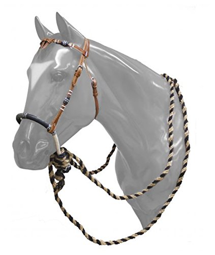 Showman Leather Futurity Knot Headstall w/ Braided Rawhide Bosal & Horse Hair Mecate Reins. This headstall features double stitched medium oil leather with a futurity knot style browband. Headstall is accented with black and natural rawhide braiding. Bosal features black and natural braided rawhide with a zig zag design and comes with hand braided, 21' two-toned horse hair mecate reins. For an average full size horse.