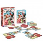 In Snorta each player is given a farm animal. In a “sound-off” everyone makes their animal’s sound, then hides it from the other players. All the animal cards are passed out. Each player quickly flips over cards into a face-up pile in front of them, going around the circle. When a card placed down matches one of the cards already on the table, those two players rush to say the animal sound of the other player. (You don’t make the noise of the animal ON the card.) It’s hard to remember everyone’s animal under pressure, so this speed and memory game is lively and funny to play. If you say the other player’s sound first, you give them all the cards you’ve flipped onto the table in front of you. They then add them to the bottom of their hand. The first person to get all the cards out of their hand is the winner.