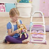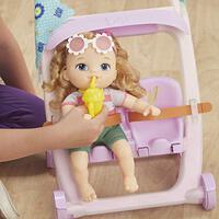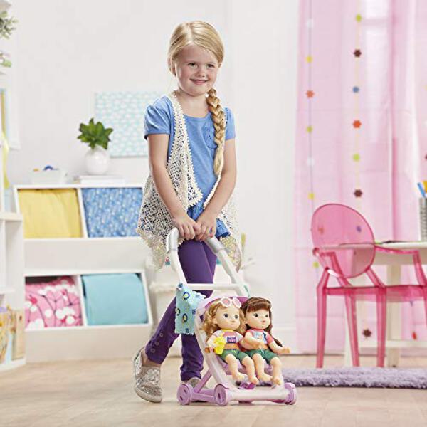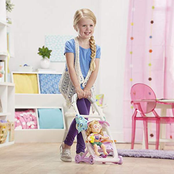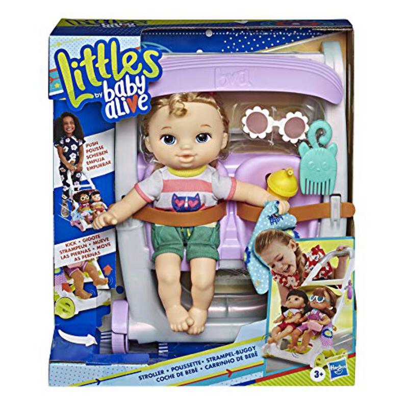 Details: Unfold, get set, and go for a push-and-kick playtime adventure with Littles by Baby Alive! When kids push the included little Ana doll in her adorable doll stroller, her legs kick up and down like a real toddler's would! Boys and girls can imagine taking their doll anywhere they want to go! The best thing is, this stroller has room for a friend, so kids can collect other dolls in the Littles by Baby Alive Squad and bring them along! (Additional dolls sold separately.) the Littles push ‘N kick stroller and doll set comes with everything kids need to make playdate adventures even more fun, including a comb for styling little ana’s pretty blonde hair, a blanket to snuggle, fashionable sunglasses for a day out and about, and a sippy cup accessory to pretend to give little Ana a drink when she's thirsty! It's a great doll and stroller toy for kids ages 3 years old and up. baby alive and all related properties are trademarks of Hasbro.