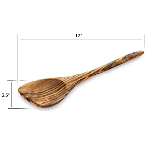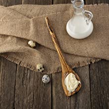 These olivewood kitchen utensils are made with genuine olive wood which is why we suggest adding a drops of olive oil to the surface to help them retain moisture, prevent cracking, and ensure long-lasting color vibrance.
