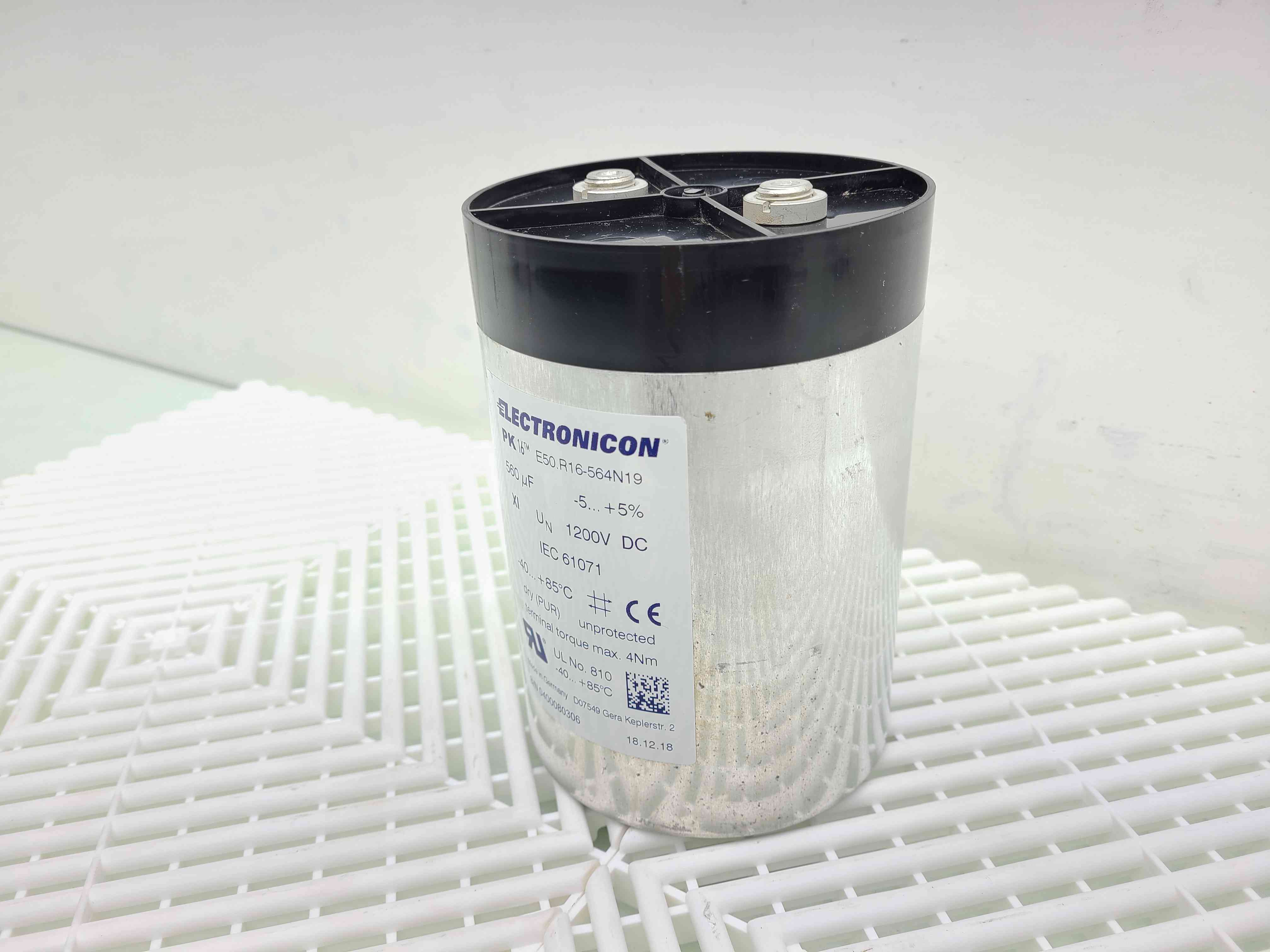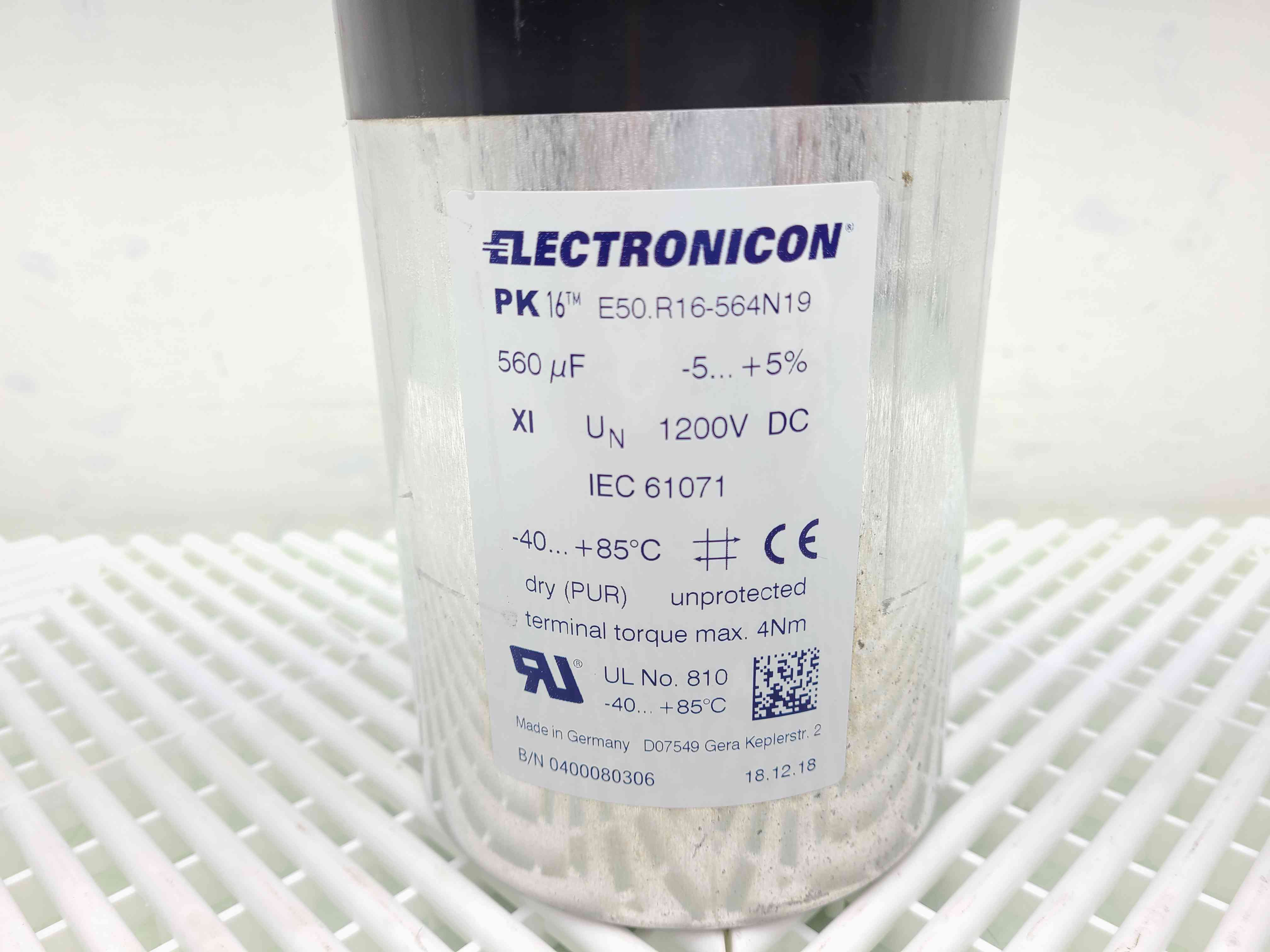 Here is a Electronicon PK16 E50.R16-564N19 Cylindrical Power Capacitor 1200VDC, 560 uF. This item is being sold use but like-new as it was implemented on a line that was never put in use. These items are in good overall condition with minimal cosmetic blemishes.