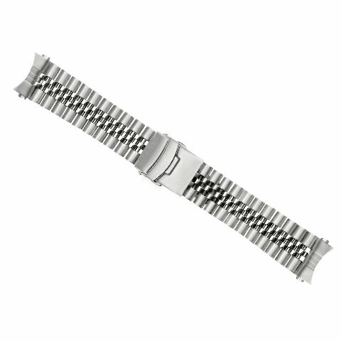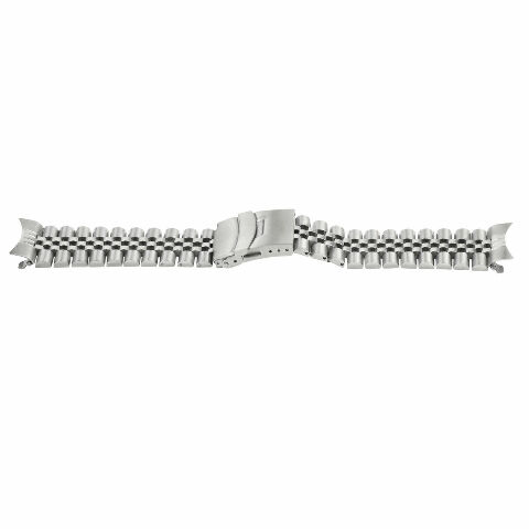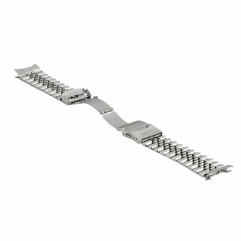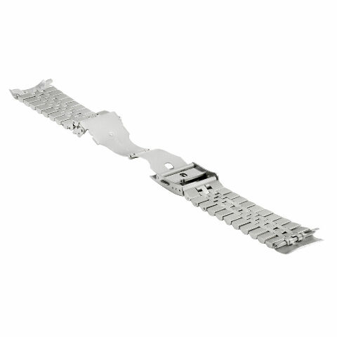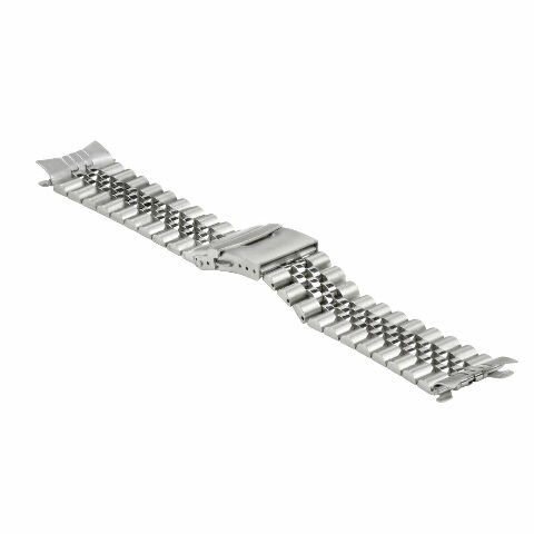 The band uses 316L stainless steel for strength and durability. It features a solid-link Jubilee construction with side links finished in a matte, logo-free surface for a clean appearance. It includes five removable links for size adjustment with pins. The band weighs 70 grams and the total length when closed is 7 inches, with a lug width of 22mm.