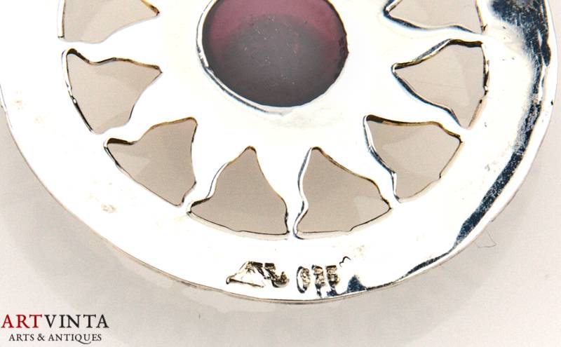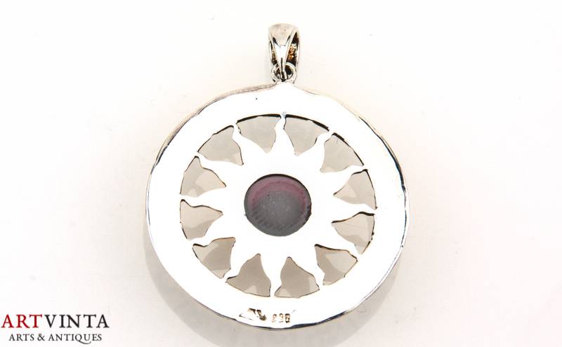 Modern pendant. Silver 925, partially gold plated. Circular, openwork. Circumferential signs of the zodiac. In the center is sun set with a cabochon of garnet. Inclusions in the stone. Traces of use.