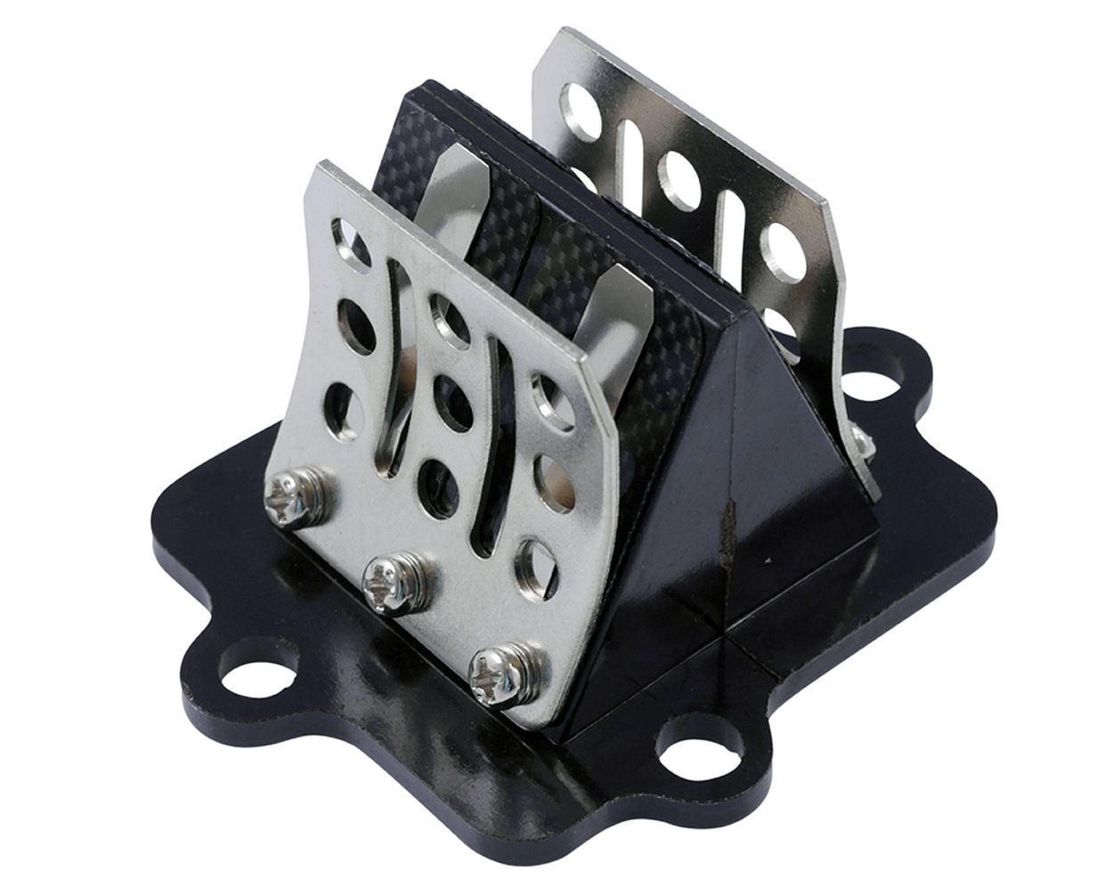 Racing Membranblock von DMP mit Carbon-Membrane, passend für Fahrzeuge mit Minarelli liegend und China 2-Takt 50ccm Motoren. Der Membranblock ist mit Carbon-Membranen ausgerüstet, die zusätzlich von Blechlamellen auf Spannung gehalten werden. Diese Bauweise dichtet nicht nur besser ab als herkömmliche Stahlmembrane, sie führt auch zu direkterem Ansprechverhalten. Bricht ein Blechmembran führt dies in der Regel zu einem kapitalen Motorschaden, Carbon-Membrane sind strapazierfähiger und bei einem Bruch bleibt ein schwerer Motorschaden aus.