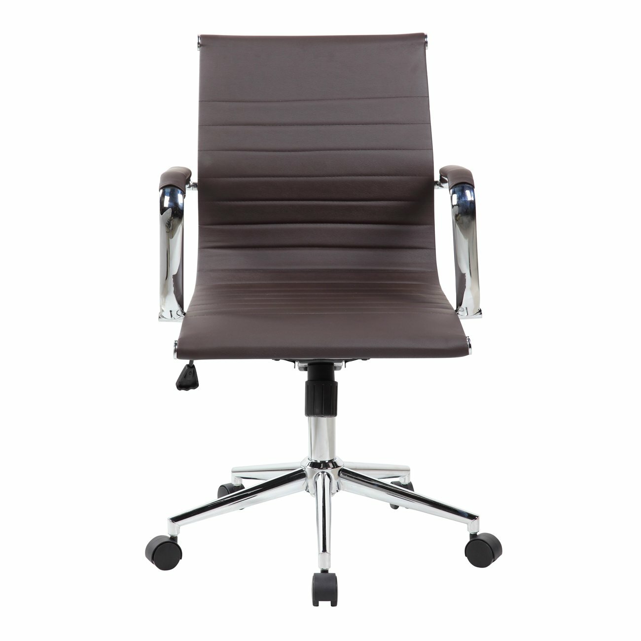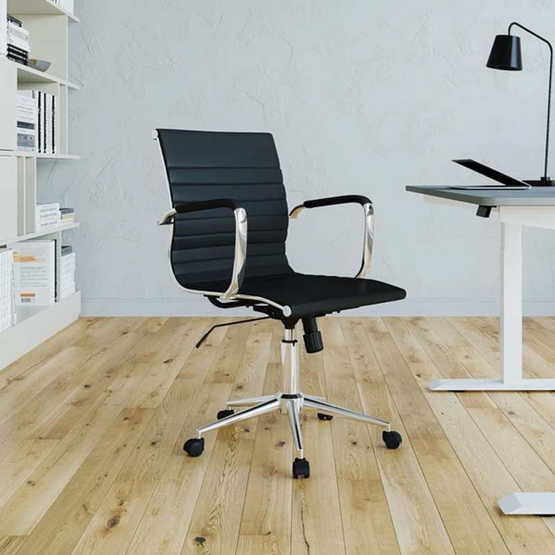 This elegant and modern Techni Mobili Executive Office Chair will add an upscale appearance to your office with its attractive stitched seat and back. Made of Techniflex upholstery with chrome steel base and chrome arms rest, the comfortable seat has built-in lumbar support and has an iconic ribbed design; features a chrome base, pneumatic seat height adjustment, armrests, and locking tilt control with a tension knob and comfortably fits users up to 200 Lbs. Color: Black & Chocolate.