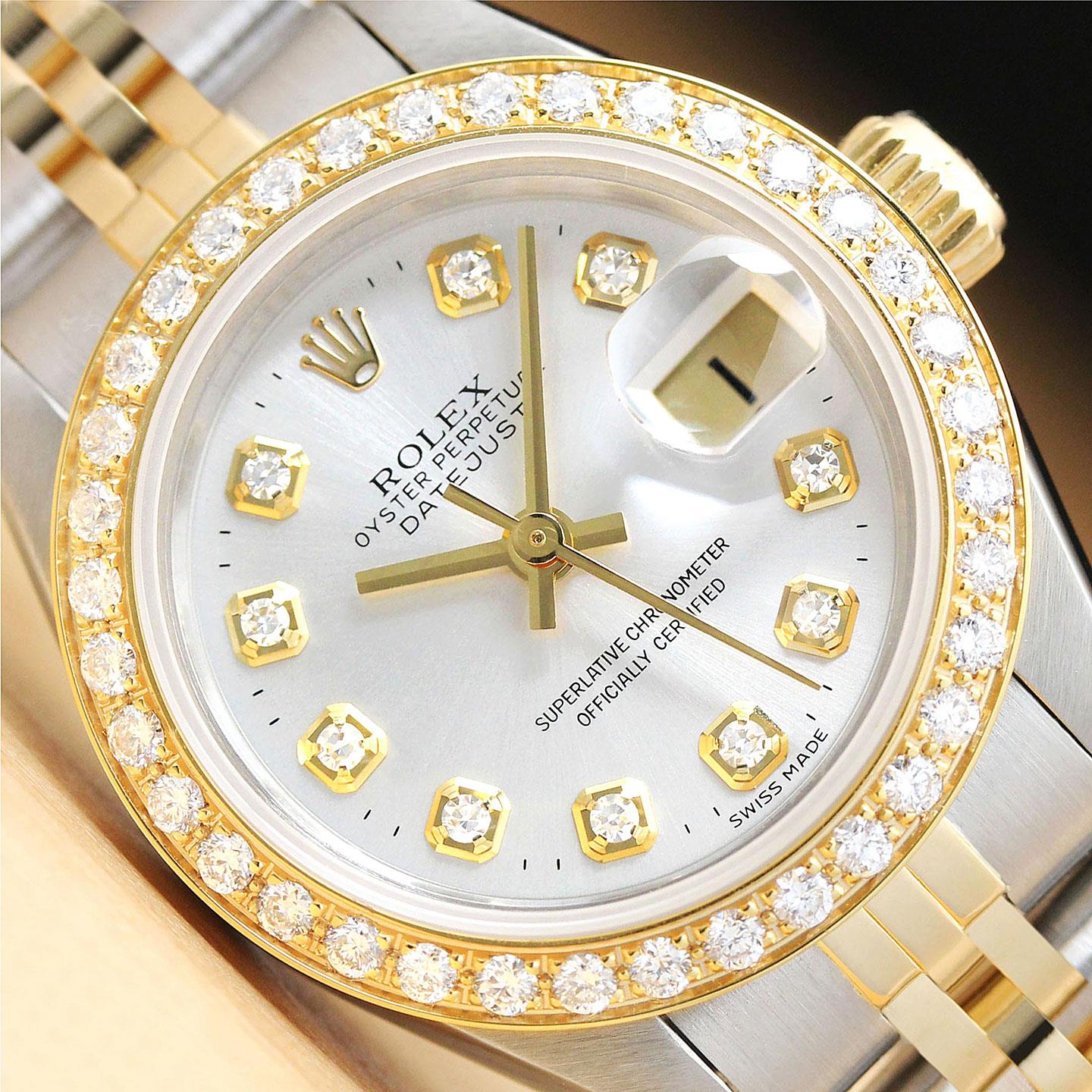This is an authentic Rolex Datejust 69173 watch with Rolex 18K yellow gold and stainless steel jubilee bracelet, Rolex dial Ref. with added genuine diamond markers, and custom 18K yellow gold diamond bezel.