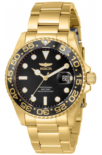 Watch Information: Gender: Women's Case Size: 38mm Dial Color: Black Material Case: Gold Tone Stainless Steel Material Band: Gold Tone Stainless Steel Diamonds: n/a Movement: Quartz Water Resist: 200 Meters Water Resistant Features: Date Display Clasp/Buckle: Fold-Over Clasp with Safety Additional Info: Packaging: Invicta Box & Papers