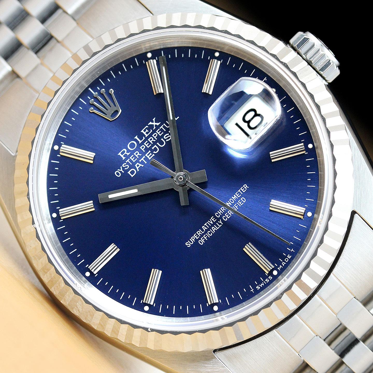 This is an authentic Rolex Datejust 16234 watch with Rolex stick dial Ref., Rolex 18K white gold fluted bezel, and Rolex stainless steel jubilee band.