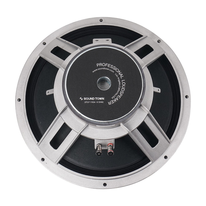 The Sound Town STLF-15GA is a 15" universal replacement woofer for PA/DJ speakers and bass guitar cabinets; it is compatible with the Sound Town PA speakers and speakers of other brands which need a 15" low-frequency driver. The woofer comes with 8-ohm impedance and has a frequency range of 45 Hz - 3.5 kHz. It is built in a cast aluminum chassis and has a paper cone with cloth edge. With 300W RMS, 600W peak power handling capability, the STLF-15GA delivers massive and deep bass and makes a great replacement woofer for your 15-inch PA speakers or bass guitar cabinets. |