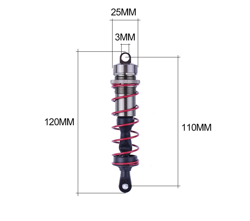 Specifications: Brand:ZD Racing Name: Front shock absorber Color: Black&Red Material: Metal Quantity: 2pcs Suitable for: ZD Racing 1/8 Scale JLB HSP HPI Redcat RC Car Total Length: 120mm / 4.72in Diameter: 25mm / 0.98in Hole Size: 3mm / 0.11in Hole to Hole Distance: 110mm / 4.33in Item weight: 38g / pcs