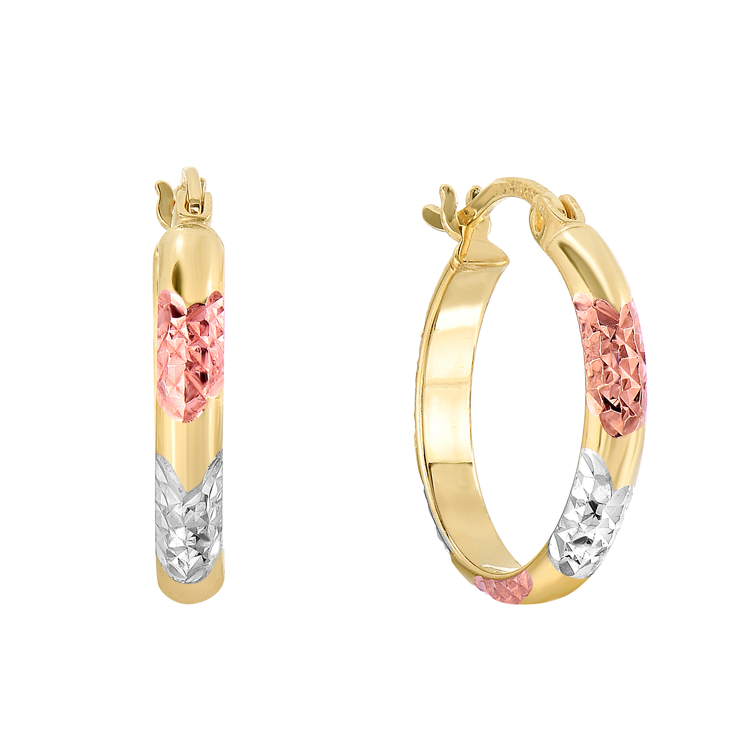Our Tricolor Diamond-cut Hoop Earrings are high polished by hand and easy with high-impact shine bright like real gold. Super lightweight for comfort, these are the perfect hoops to anchor your ear party! Recommended for your standard lobe piercing.