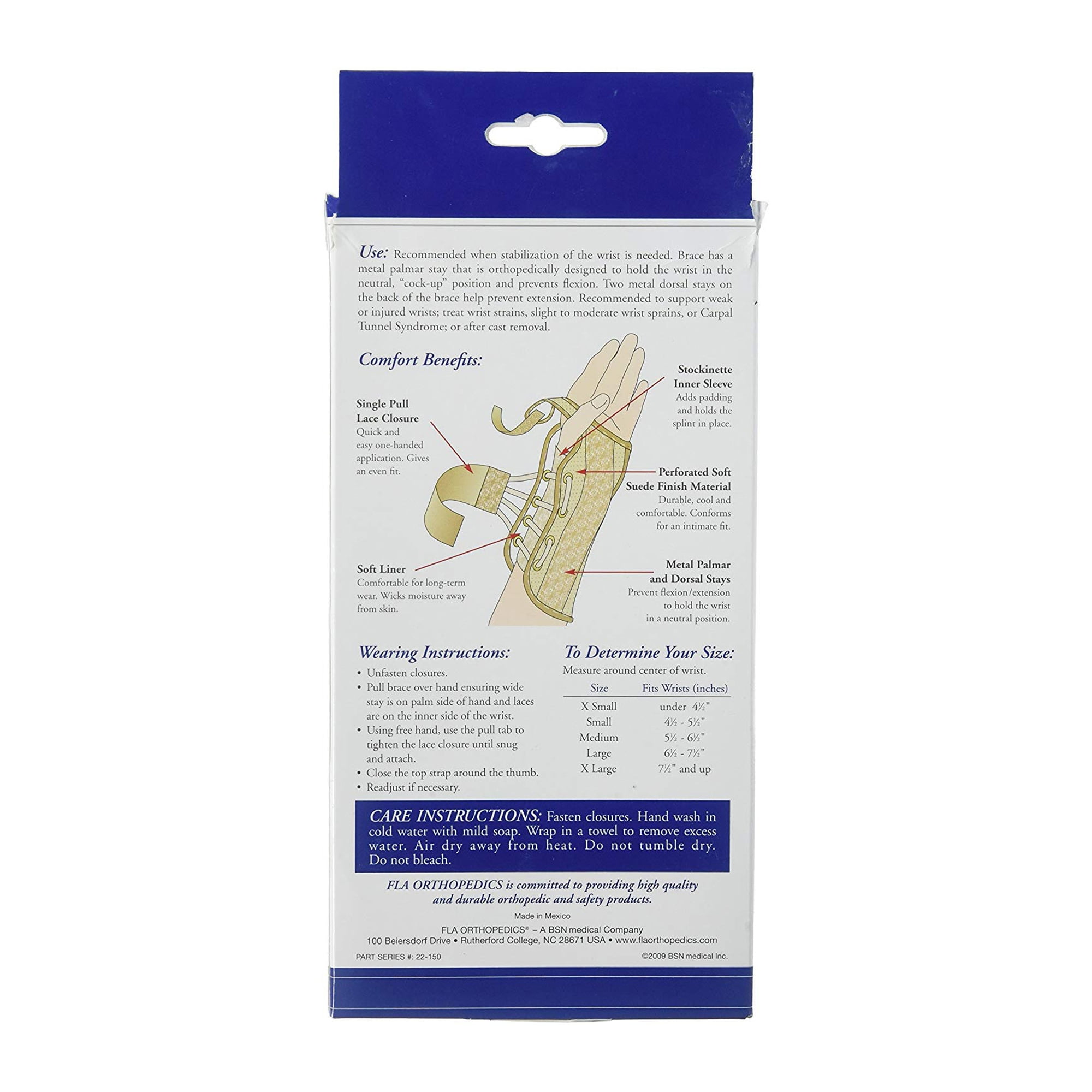 Brace has a metal palmar stay that is orthopedically designed to hold the wrist in the neutral, "cock-up" position and prevents flexion.