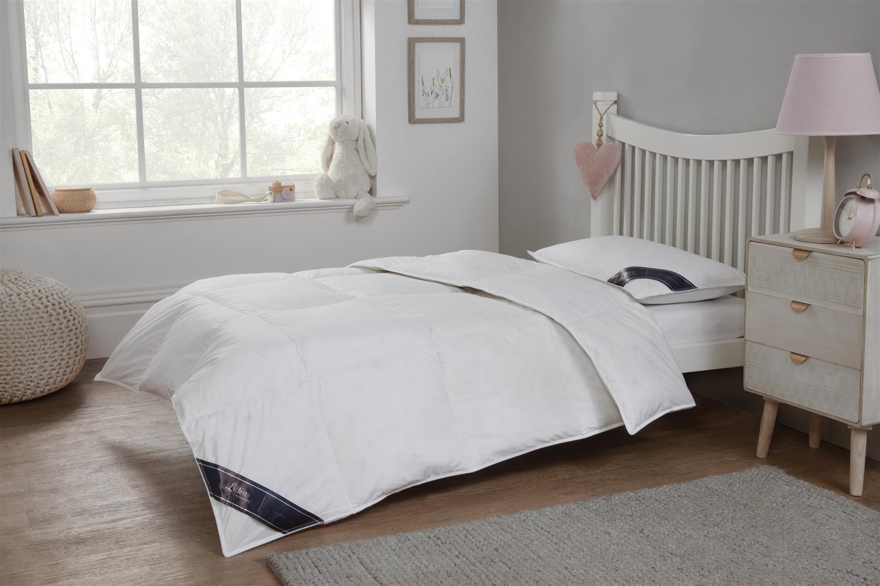 This is a luxury junior bed size goose feather and down duvet. It has a perfect balance of filling with 85% white goose feather and 15% goose down, offering luxury, comfort and warmth. This duvet is constructed in a box stitch with the highest of care to help evenly distribute and hold the feather filling in each chamber and a 230 thread count 100% pure cotton cambric fabric has been used to finish it. This duvet has naturally breathable qualities, which help regulate your toddlers body temperature through the night, trapping warm air to keep them snug but preventing discomfort from over-heating. The duvet has been finished with a double stitched edge and fine piping. Suitable for a 69cm x 139cm or 70cm x 140cm Bed.