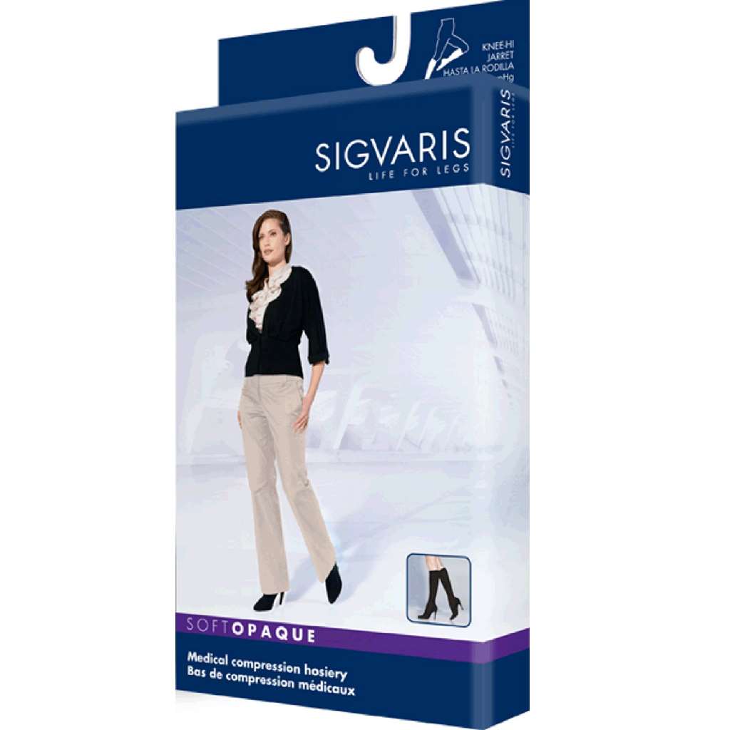 The SIGVARIS Soft Opaque Knee-High (Long Length) is a durable, fashionable 20-30 mmHg graduated compression stocking designed for daily wear. Made with soft microfiber and double-covered inlay yarns, it ensures easy application, comfort, and moisture management. Ideal for managing venous issues, it features a secure, comfortable top band to prevent rolling.