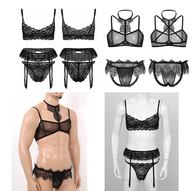 Men See-through Floral Lace Lingerie Set Sissy Underwear Nightwear Unlined Bra with Thongs Garter Belt.