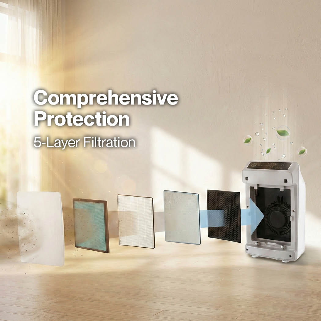 5-Layer Filtration: Designed for maximum impact, this system combines multiple filtration technologies—including pre-filters and cold catalysts—to trap pollutants of all sizes, from pet hair to hazardous benzene.