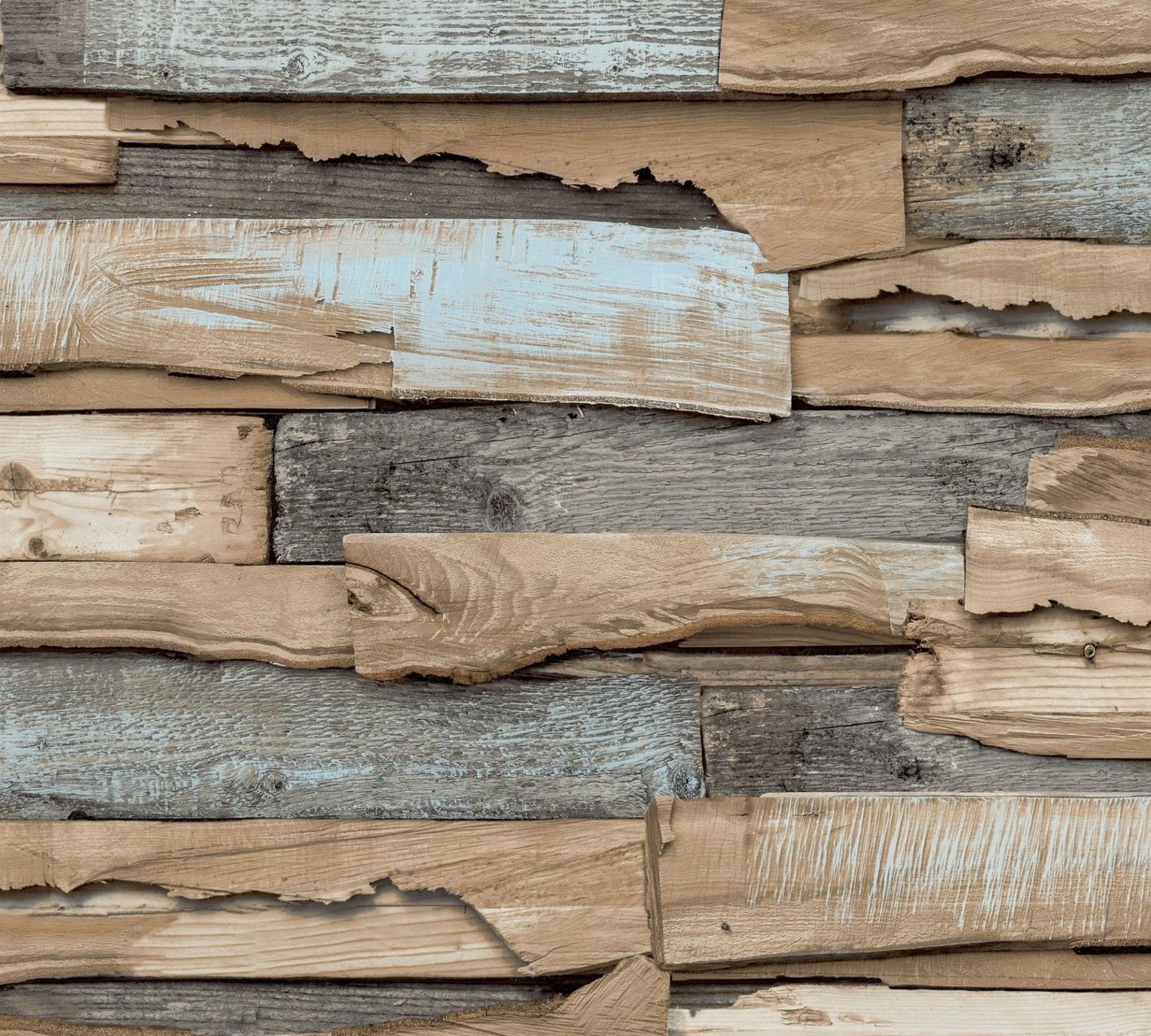 Transform your living space with this amazing wood panel wallpaper from Grandeco. Features a stunning rustic style print throughout, finished in a aqua and grey colourway for a truly mesmerising wallcovering.