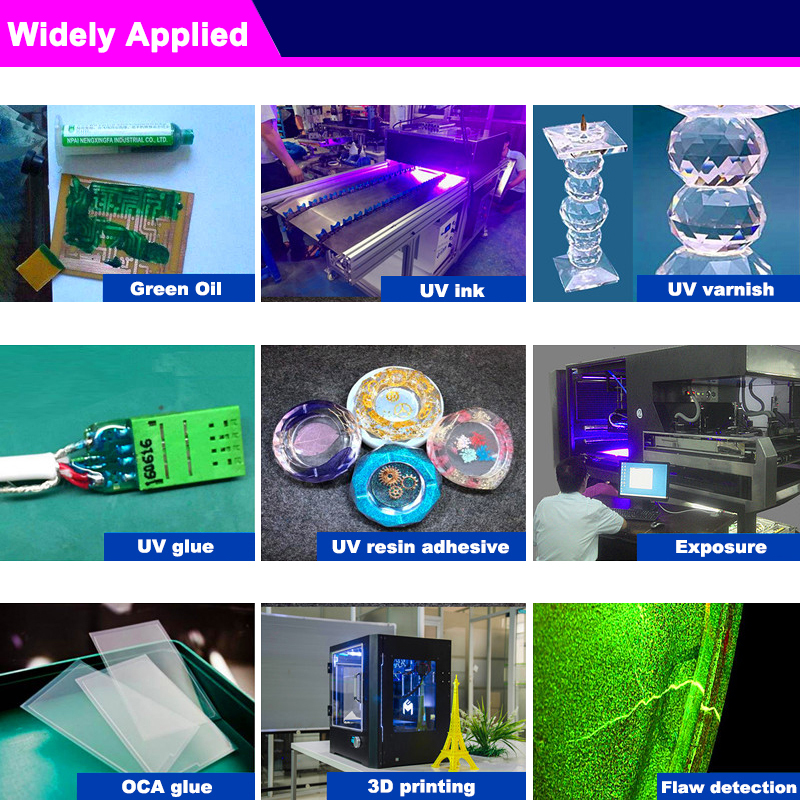 Wide range of applications: 1. Optical communication devices (PLC splitter, CWDM, array grating waveguide AWG and other glass packaging structure bonding) 2. Small speaker device bonding, semiconductor chip packaging, sensor production, hard disk head bonding, mobile phone component assembly. 3. In medical equipment, syringes, catheters, biochips, endoscopes, bonding PVC, etc. 4. Small optical lens bonding (microscope, infrared instrument, telescope, night vision device) 5. PCB board (capacitors, inductors, chips), circuit board protective coating, and fixed coils. 6. Research institutions: semiconductors, communication laboratories, medical polymer materials,photo catalysis and other applications.