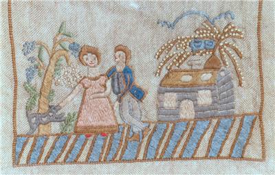 Found at a local estate auction, this wonderful framed embroidery sampler was made by Marion Madison in the year 1830. The dimensional quality of the embroidery contrasts nicely with the textured background fabric. The message under the attribution on top, says-