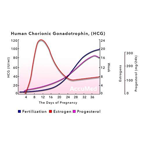 It measures the levels of the pregnancy hormone human chorionic gonadotropin (HCG) in your urine. This hormone is produced by the cells of the embryo that will later form the placenta. The level of HCG increases from its basal level of less than 5 mIU/mL directly after implantation, and doubles after each 48 hours during the first weeks of pregnancy.
