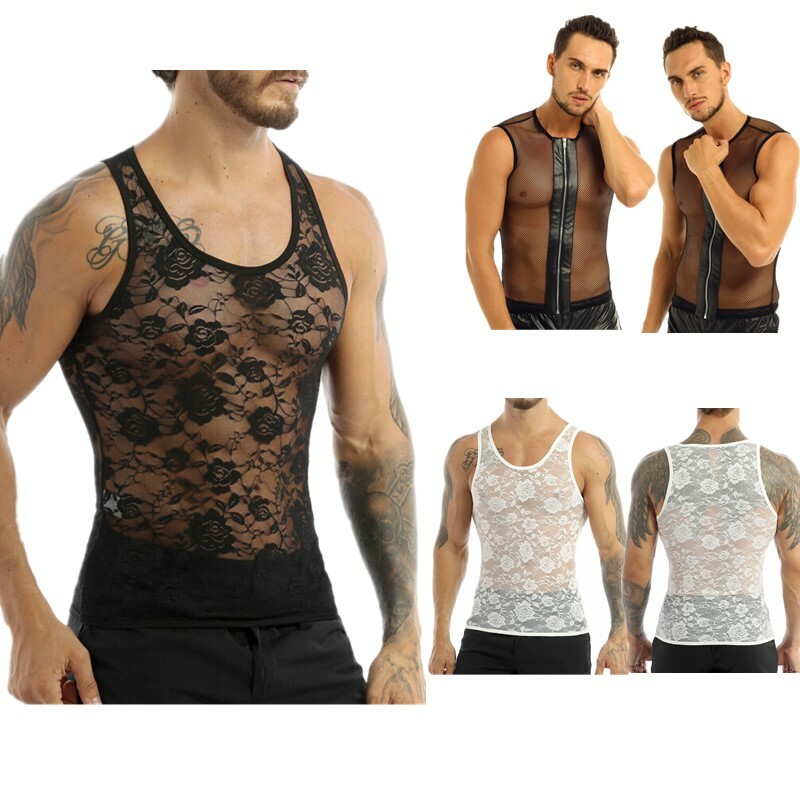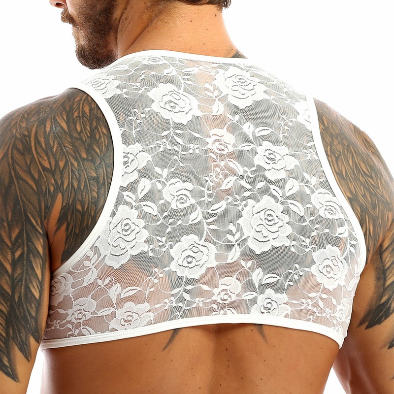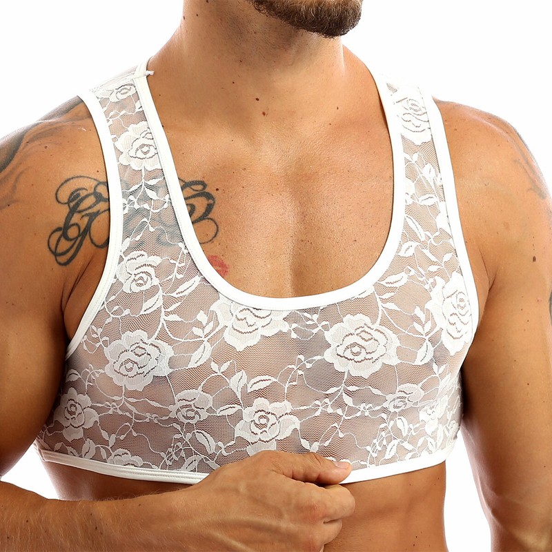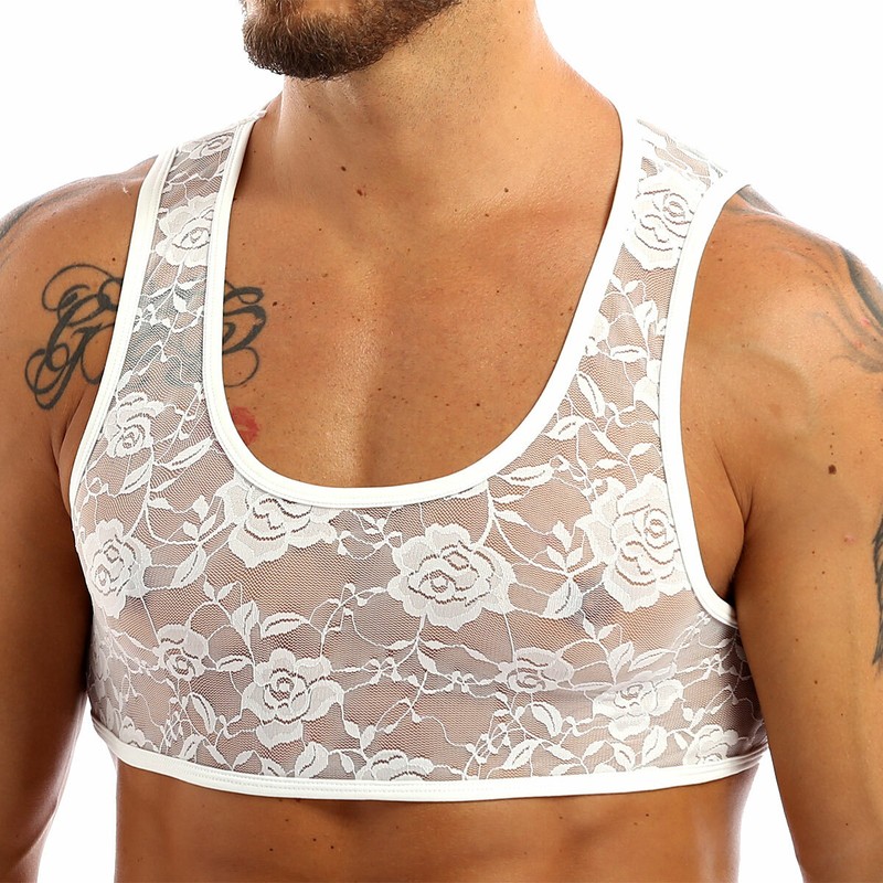 Men’s sissy stretchy floral lace short vest crop tops, pull on closure.