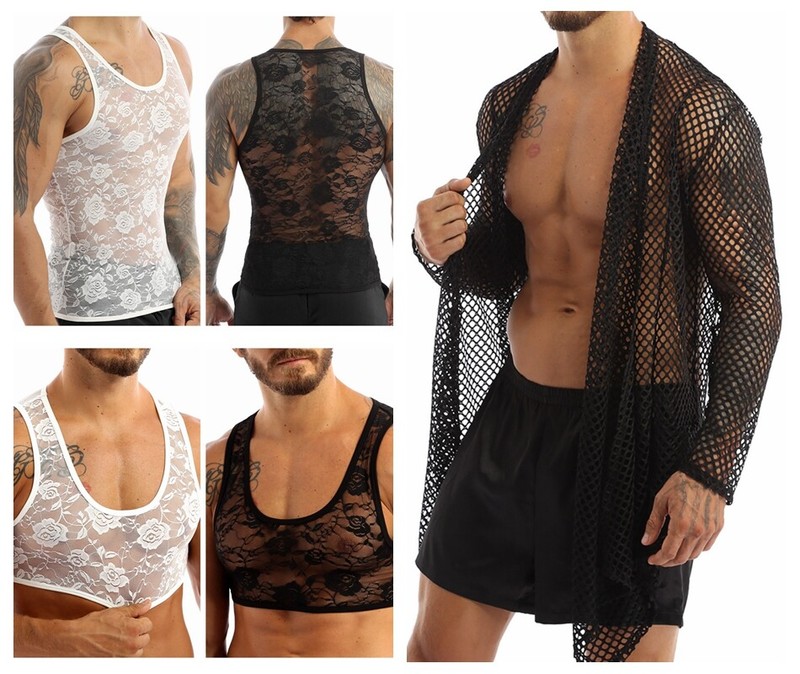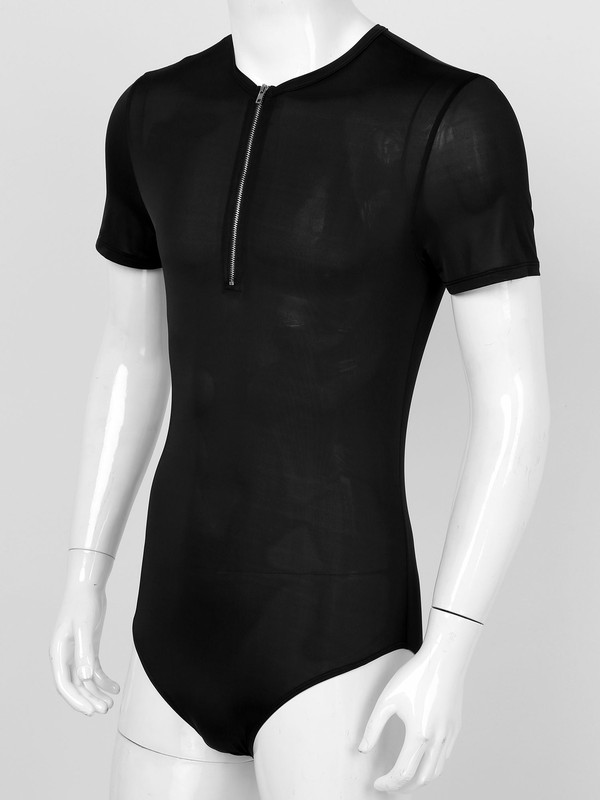 Men’s one-piece crossdress bodysuit lingerie, sleeveless and see through design.