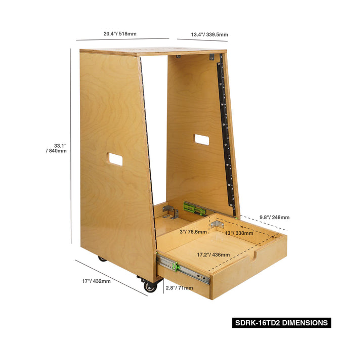 Sound Town 16U DIY Slanted Studio Rack with 16U Rack Space, Extra 2U Drawer, Plywood, Rubber Feet, Casters, Golden Oak |