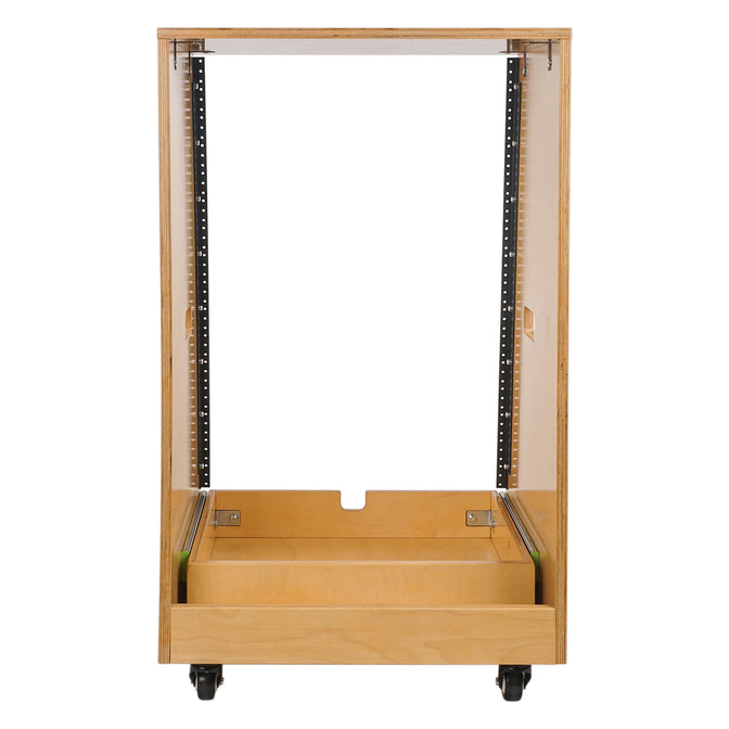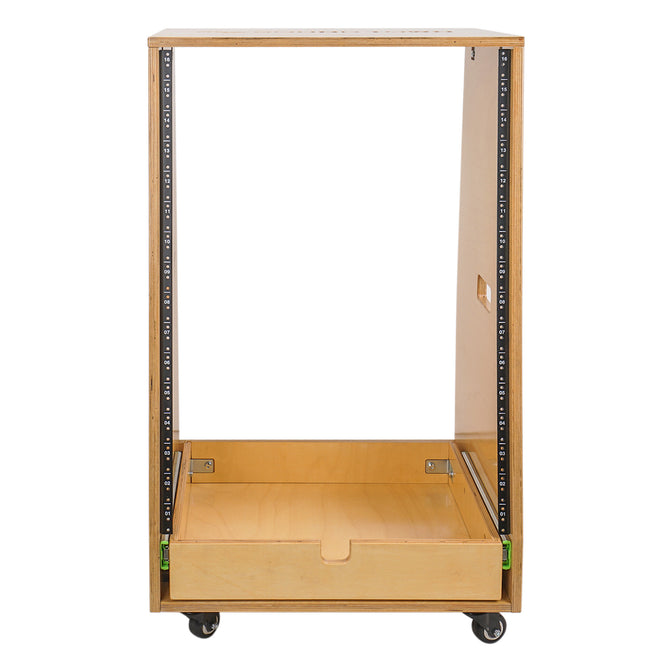 - Slide-out 2U drawer at the bottom provides storage space for microphones, cables, mixers, drum machines and more