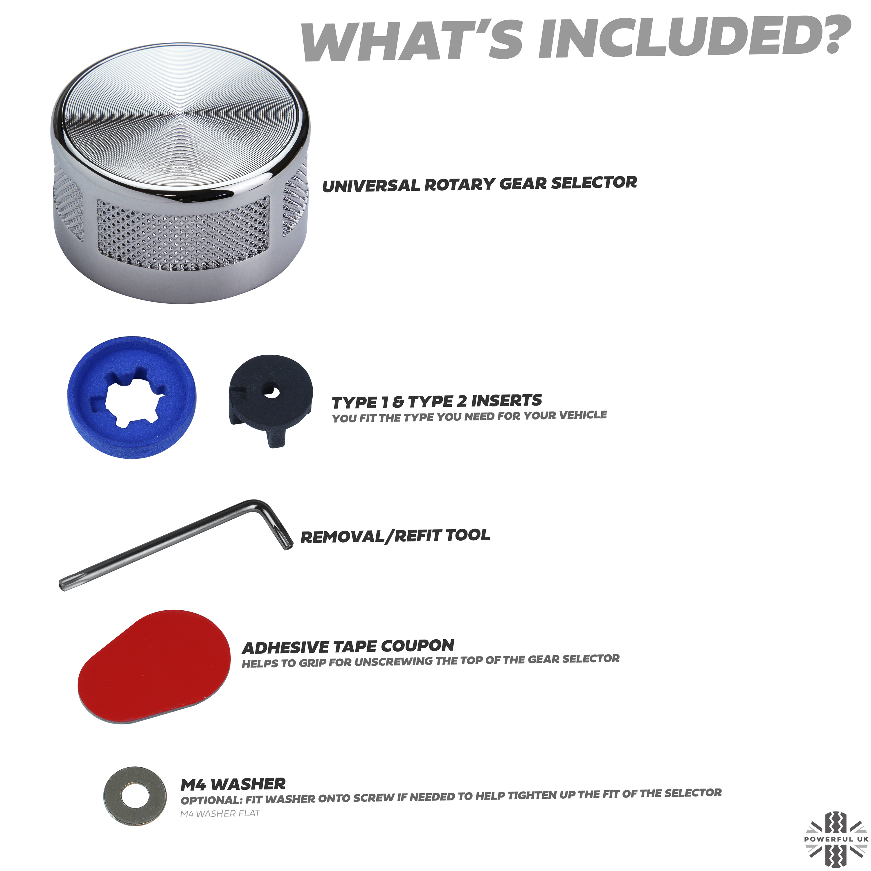 These heavyweight solid metal gear selectors come with 2 inserts - you just fit whichever insert for your vehicle.
