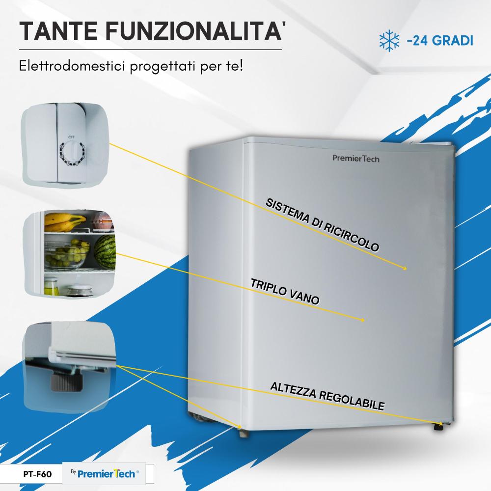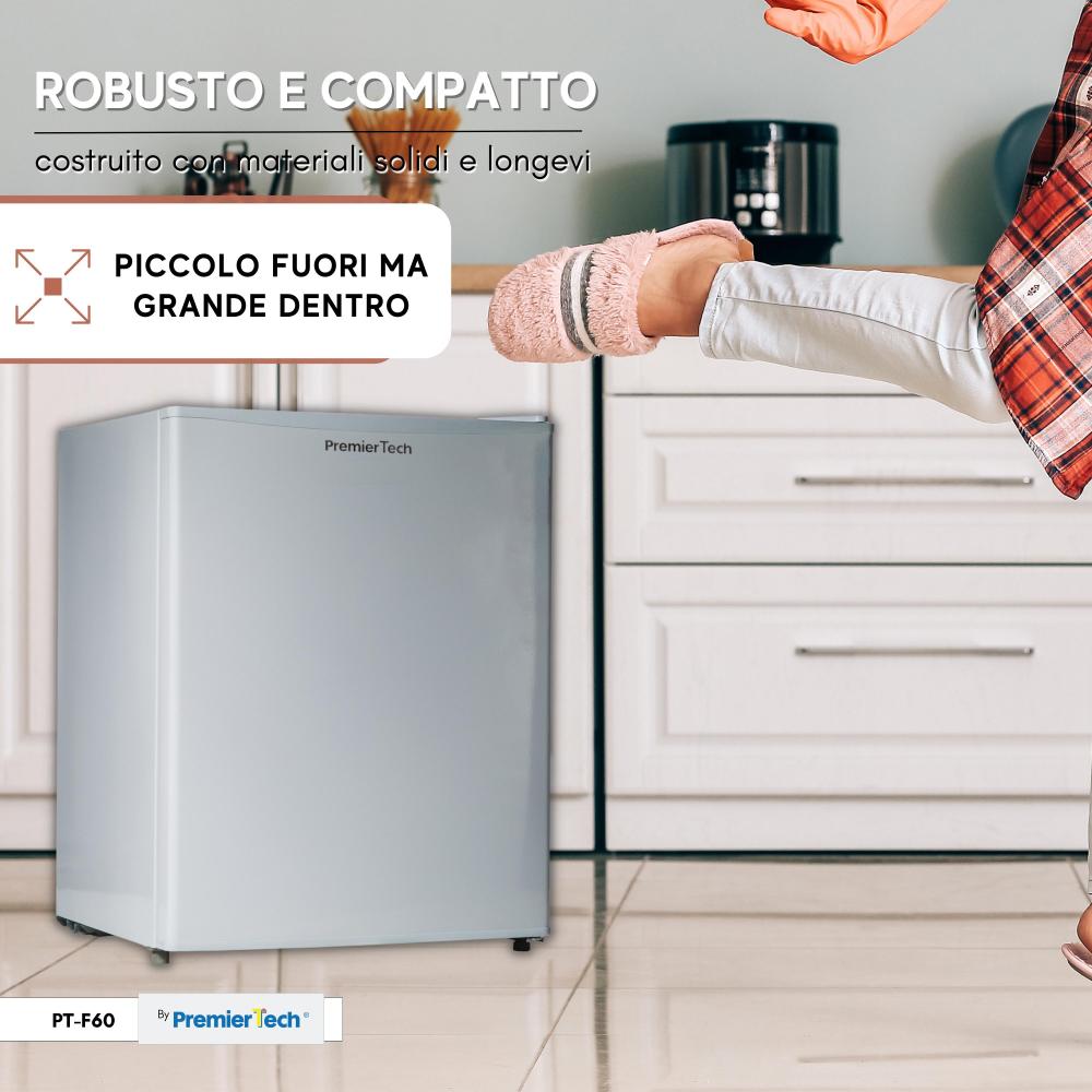 PremierTech PT-F60 è un minifrigo dal design semplice e lineare, caratterizzato da una forma rettangolare e da una notevole compattezza.