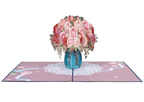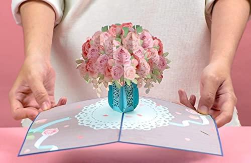 Paper Love Pink Roses Pop Up Card, Handmade 3D Popup Greeting Cards for