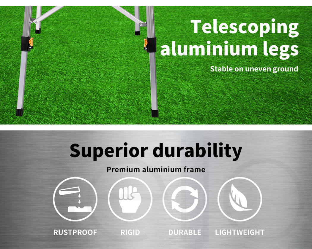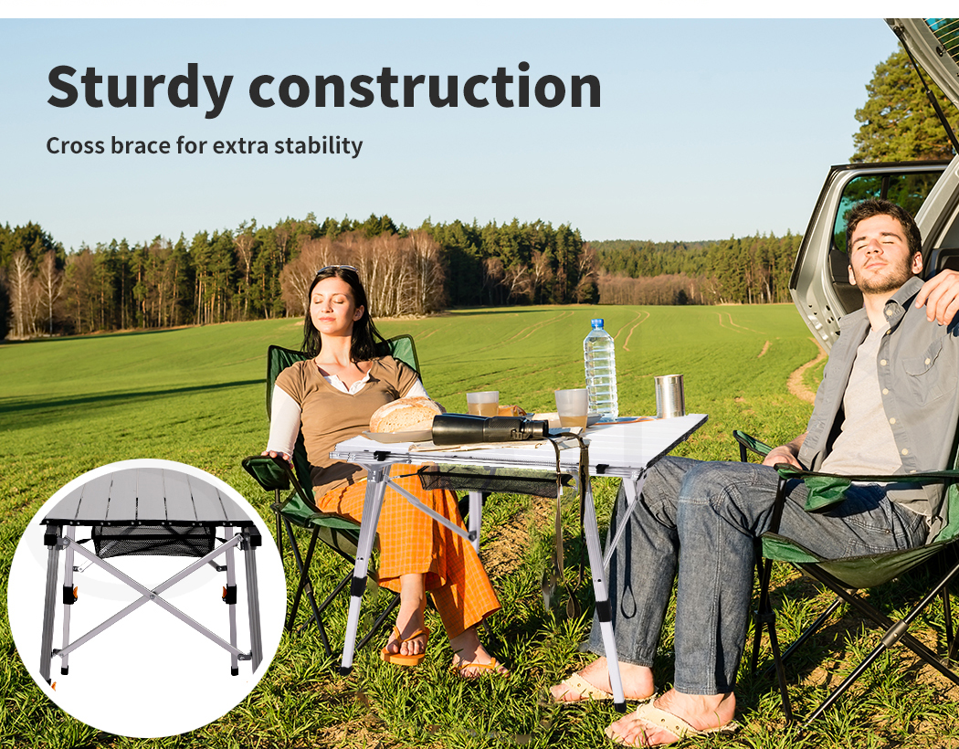 Store extra food and utensils under your folding camping table. Keep them off the ground and away from ants and insects. Enjoy the lightweight transportability of your aluminium table.