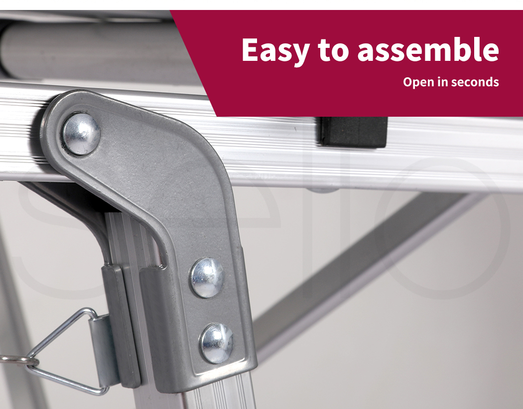 Your folding trestle table folds all the way up into an easy to carry bag. Roll the tabletop open and connect the cross-brace legs. It ain’t rocket surgery. If it gets dirty, then wipe it down with a wet cloth or use a hose.