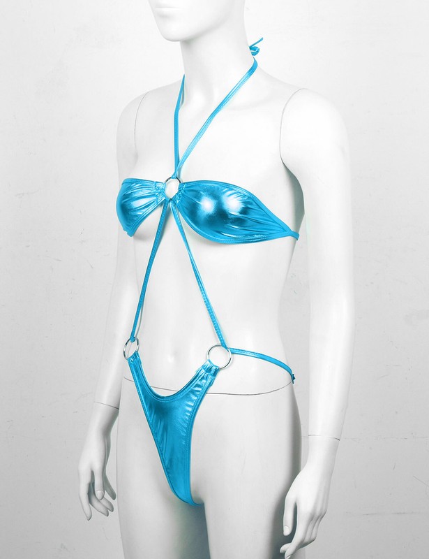 Minimal coverage with metal O-ring, backless, halter neck self-tie design, can be adjustable to fit your size.