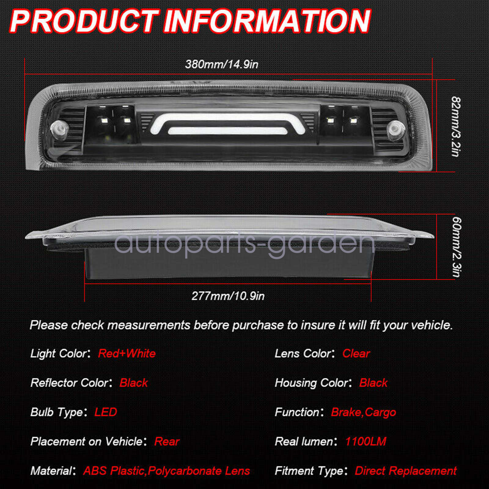 【Special Design】Premium quality ABS+Polycarbonate Lens+3D LED. The LED third brake light has a polycarbonate lens with free form reflector, and available with either the Clear lens. This Cleard housing 3rd brake light will replace your dull factory one