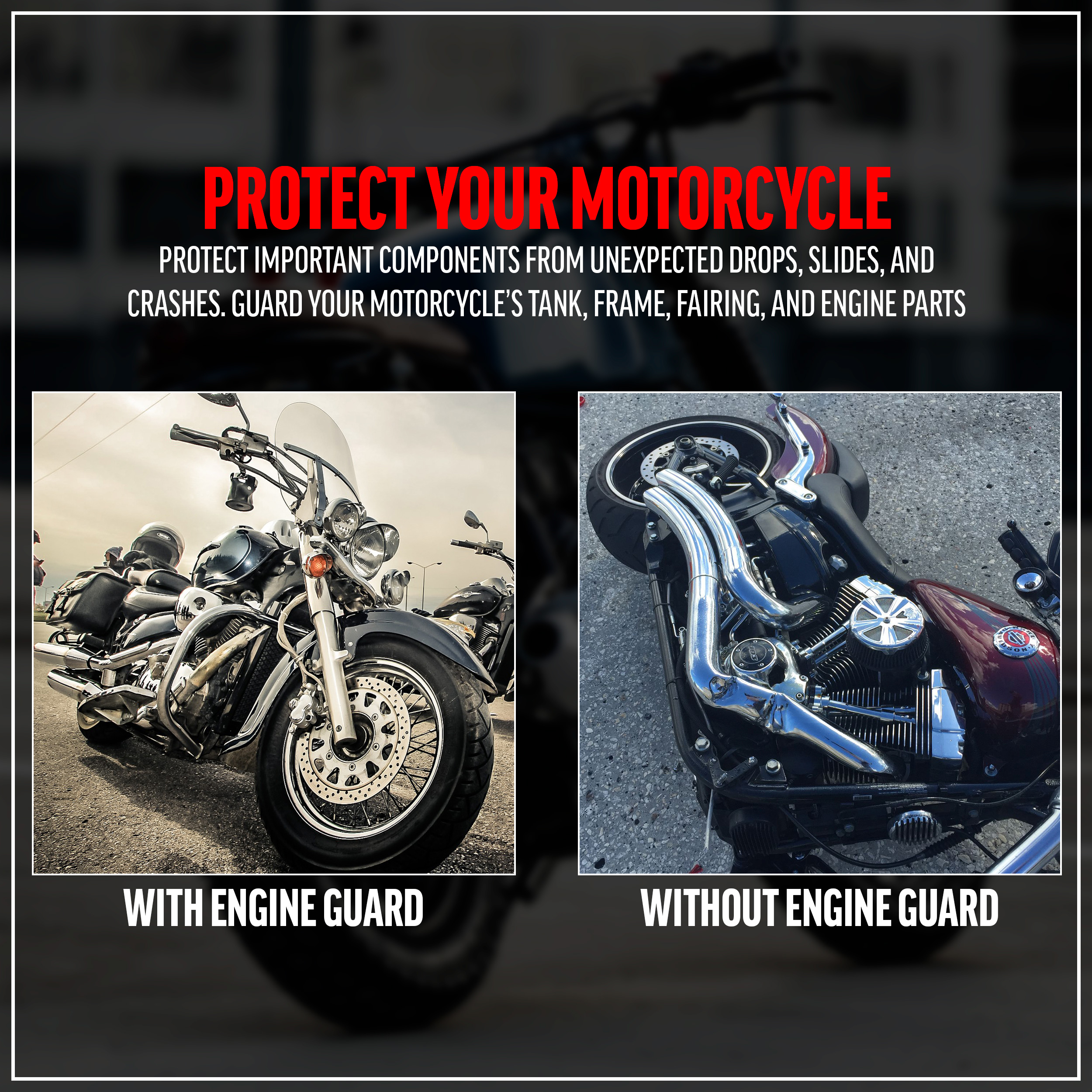 - Maintain the Value of Your Motorcycle by Protecting Important Components from Unexpected Drops, Slides, and Crashes. Guard your Motorcycle’s Tank, Frame, Fairing, and Engine Parts