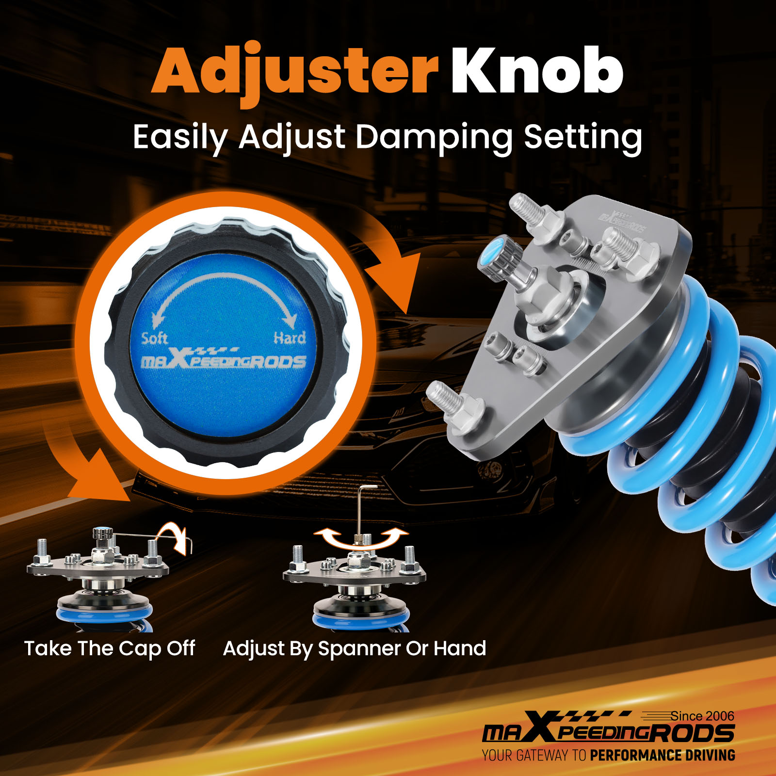 4. 24 Clicks of Rebound Adjustments -- This allows you the ability to perfectly dial in your coilovers system. For a nice comfortable driving, set damping to full soft. For more spirited driving, set it to 16 clicks. For occasional track days, set it to full stiff.