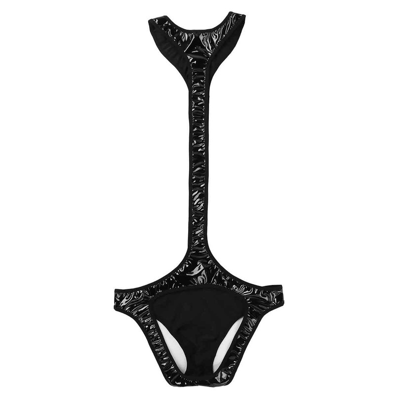 Men’s one-piece singlet tight underwear, shiny patent leather fabric, glossy appearance.