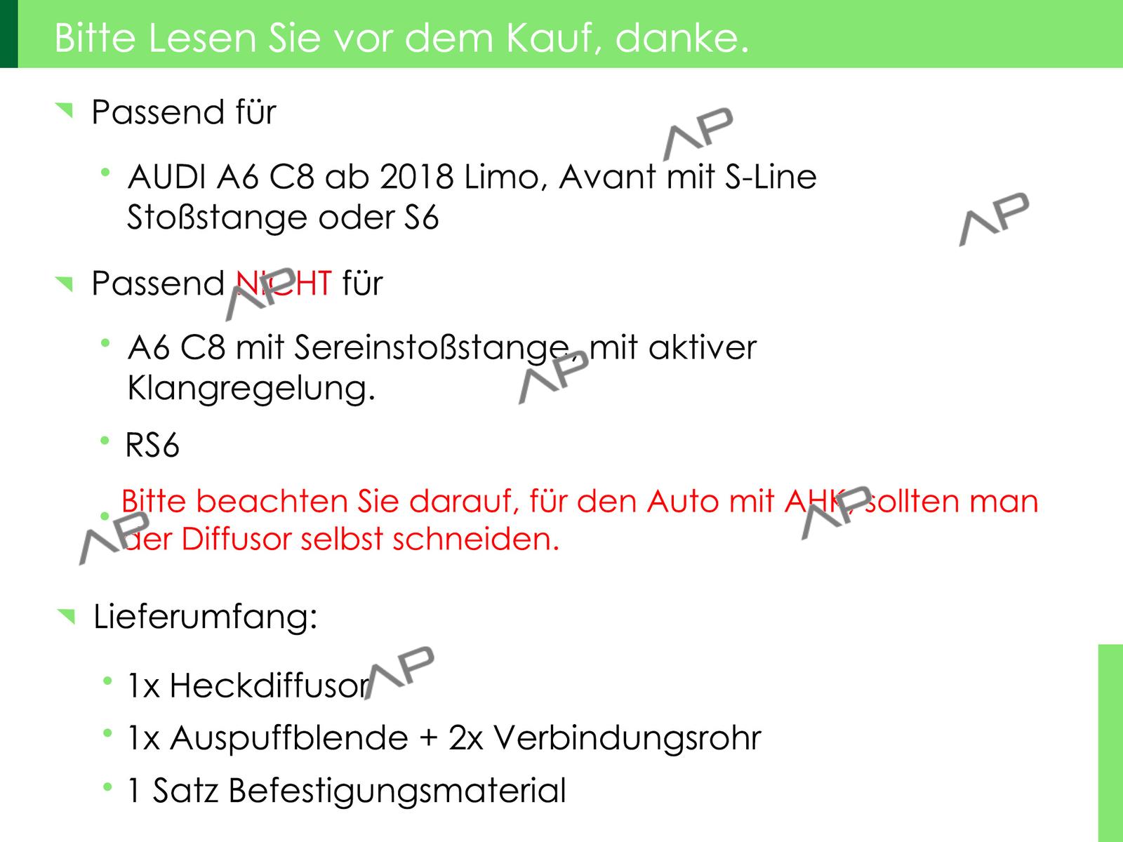 Bitte beachten Sie darauf, für das Auto mit Anhänerkupplung sollten Sie den Diffusor selbst schneiden.