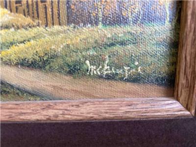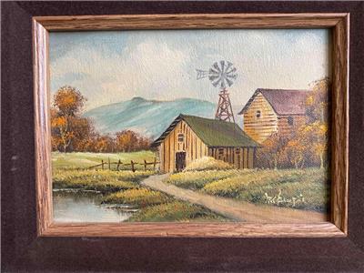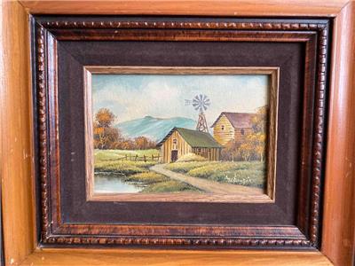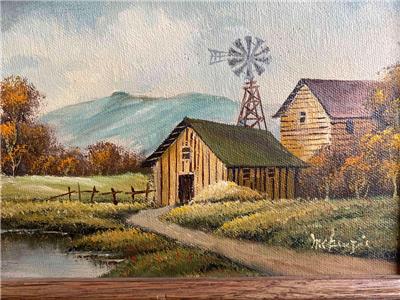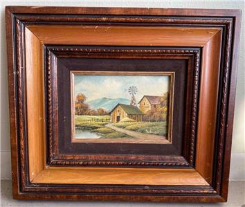 Small vintage landscape painting with barn.