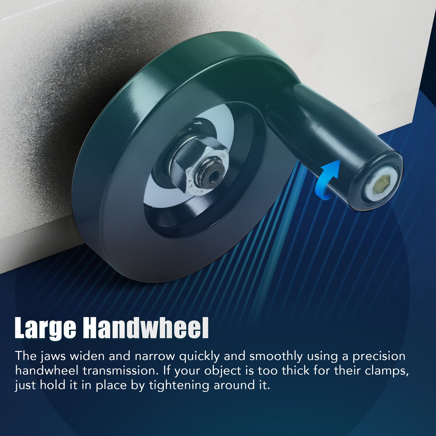 The jaws widen and narrow quickly and smoothly using a precision handwheel transmission. If your object is too thick for their clamps, just hold it in place by tightening around it.