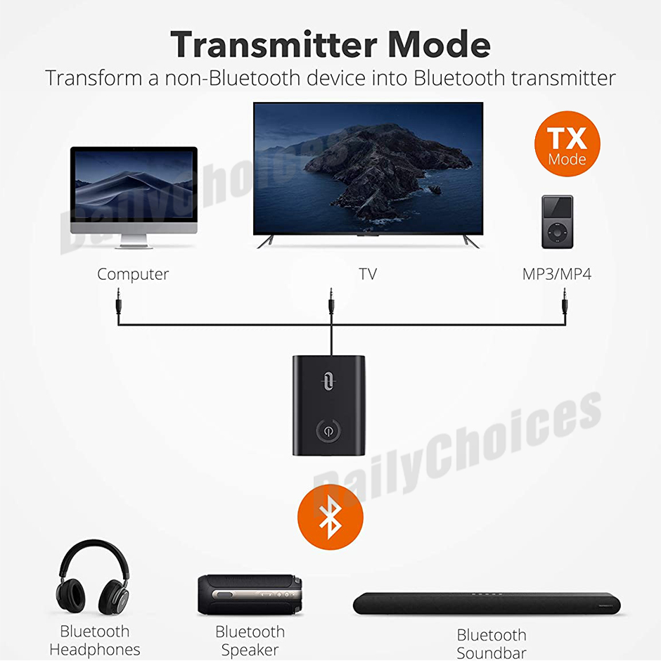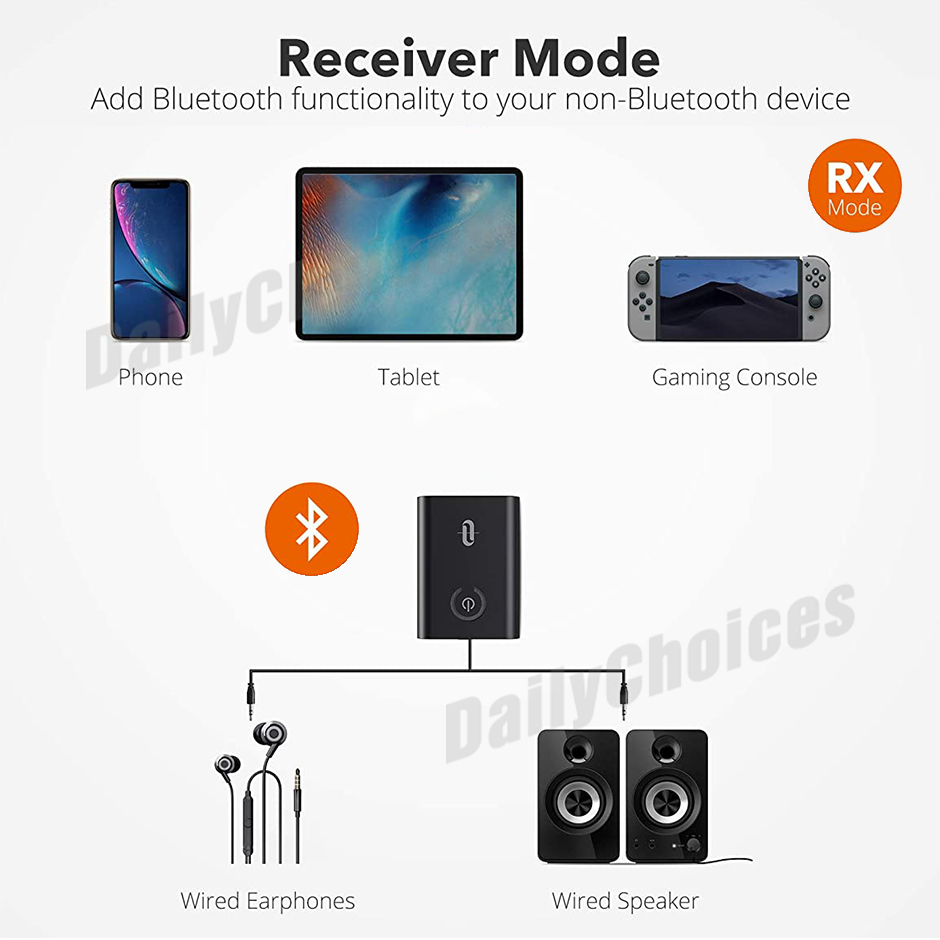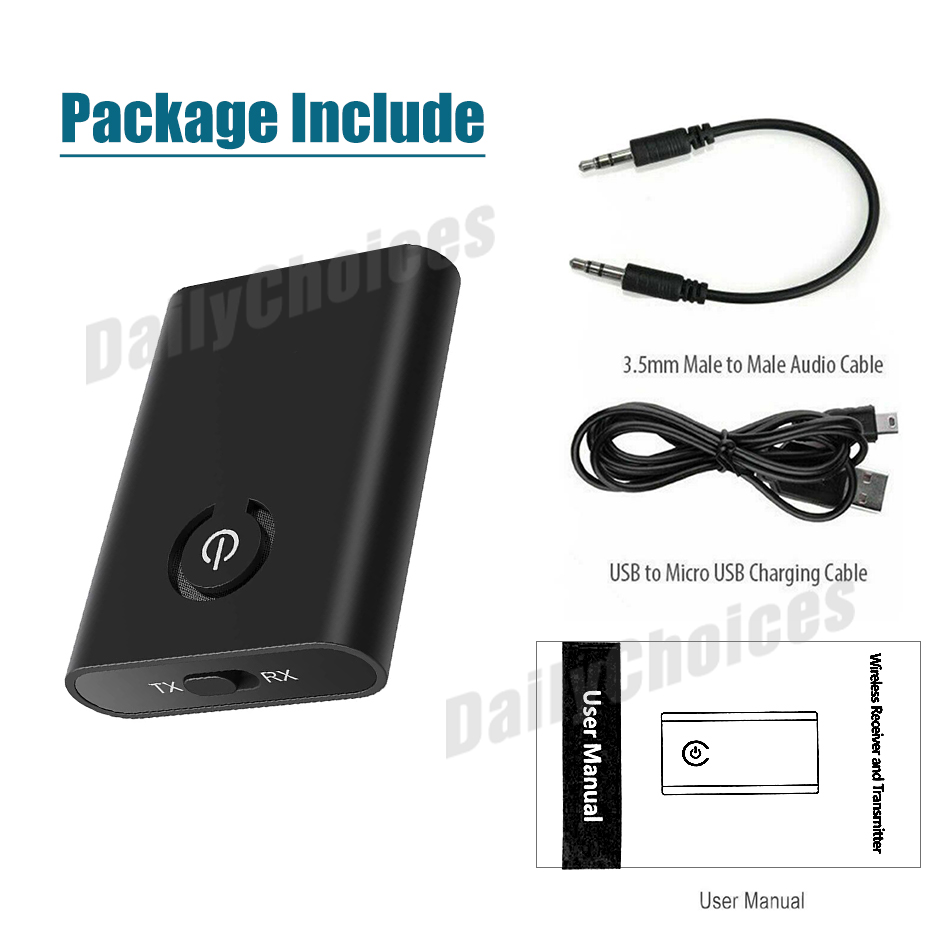 This product uses AUX to connect with a playback device, and transmits audio to a Bluetooth receiving device (such as a Bluetooth headset) via Bluetooth.