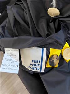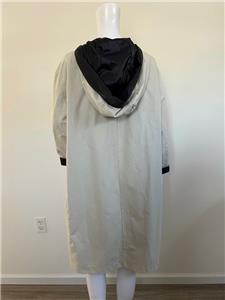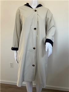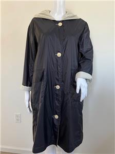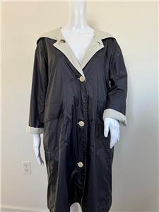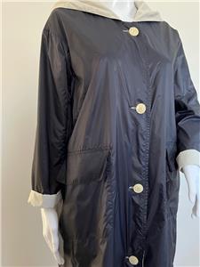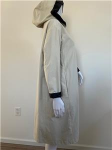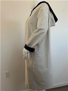 Great looking light khaki and black cotton blend hooded reversible raincoat from PRET POUR PARTIR is very wearable - great relaxed style with side seam and large patch pockets finished with flaps and button on reverse - wonderful stylish rain gear is nice and light weight.